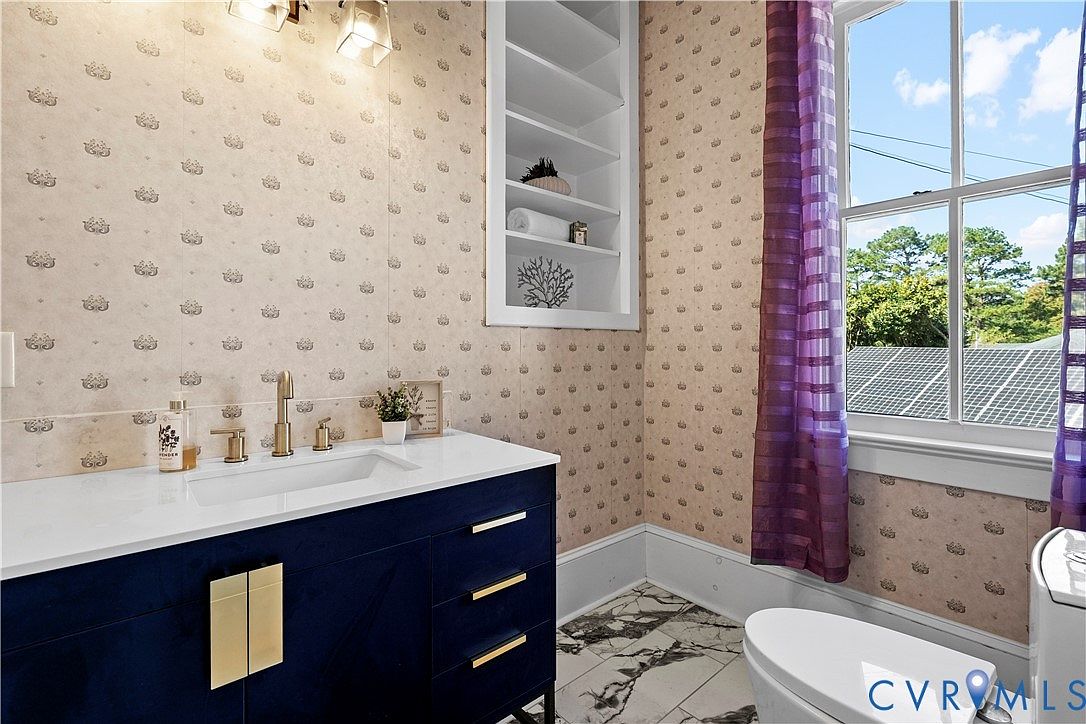 This charming bathroom features a blend of contemporary and vintage styles. A sleek, navy blue vanity contrasts beautifully with the light, patterned wallpaper, creating a warm, inviting atmosphere. The white marble flooring adds a touch of elegance, while the large window floods the space with natural light. Equipped with modern fixtures in brushed gold, the room emphasizes luxury and functionality. Family-friendly elements, like the convenient layout and ample storage, enhance practicality. Sheer purple curtains soften the sunlight, adding a pop of color that harmonizes with the sophisticated decor, making this space perfect for relaxation and rejuvenation.