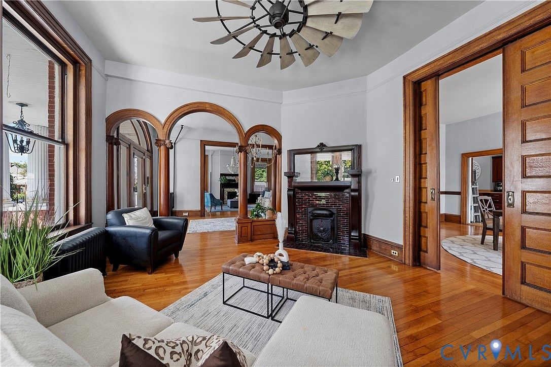 This inviting living room features a harmonious blend of classic and modern design elements. The layout allows for effortless flow between spaces, highlighted by elegant archways and large windows that invite natural light. A plush white sofa provides comfort, complemented by a stylish tufted coffee table and contemporary decor. Rich hardwood floors contrast beautifully with the soft gray walls, while the vintage fireplace serves as a focal point, exuding warmth and charm. The inclusion of potted plants adds a touch of greenery, making the space perfect for both family gatherings and quiet evenings at home.