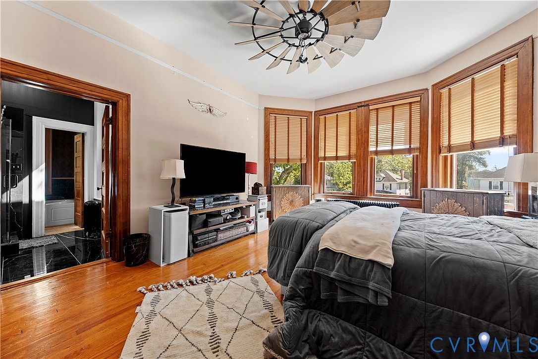 This master bedroom effortlessly blends comfort and elegance, featuring rich hardwood floors that radiate warmth. A plush king-sized bed, adorned with textured linens and throw pillows, invites restful nights. Natural light floods the space through large, classic windows dressed in wooden blinds, highlighting the charming architectural details of the home. The room is completed with a cozy armchair, a chic nightstand, and tasteful artwork that adds a modern touch. The airy color palette of whites and soft greys enhances tranquility, while the ceiling fan adds a practical element, making this serene retreat perfect for relaxation and rejuvenation.