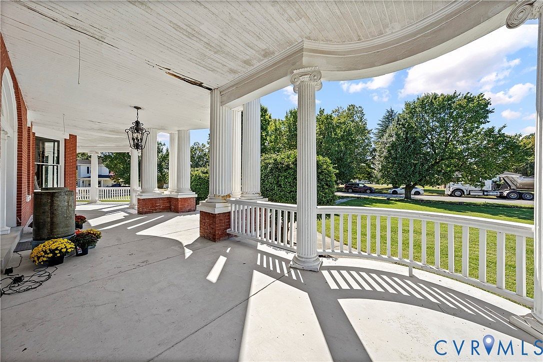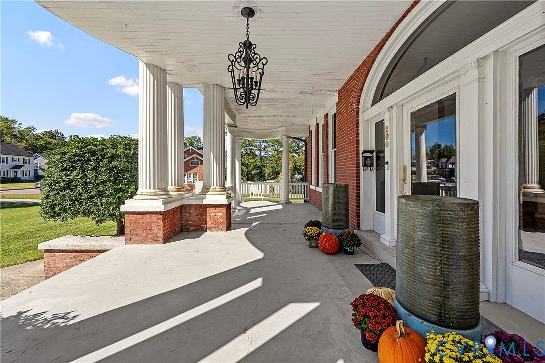 This inviting front porch features a grand architectural design with striking white columns and a spacious layout, creating a perfect entry point to the home. The polished concrete floor enhances the contemporary feel while maintaining a traditional charm. Lush greenery frames the view, complementing the warm brick facade of the house. Subtle fall decorations, including vibrant pumpkins and seasonal blooms, add a touch of color and warmth, making it family-friendly and welcoming. A stylish chandelier hangs overhead, casting gentle light, while the expansive space allows for comfortable seating, ideal for gatherings or quiet moments outdoors.