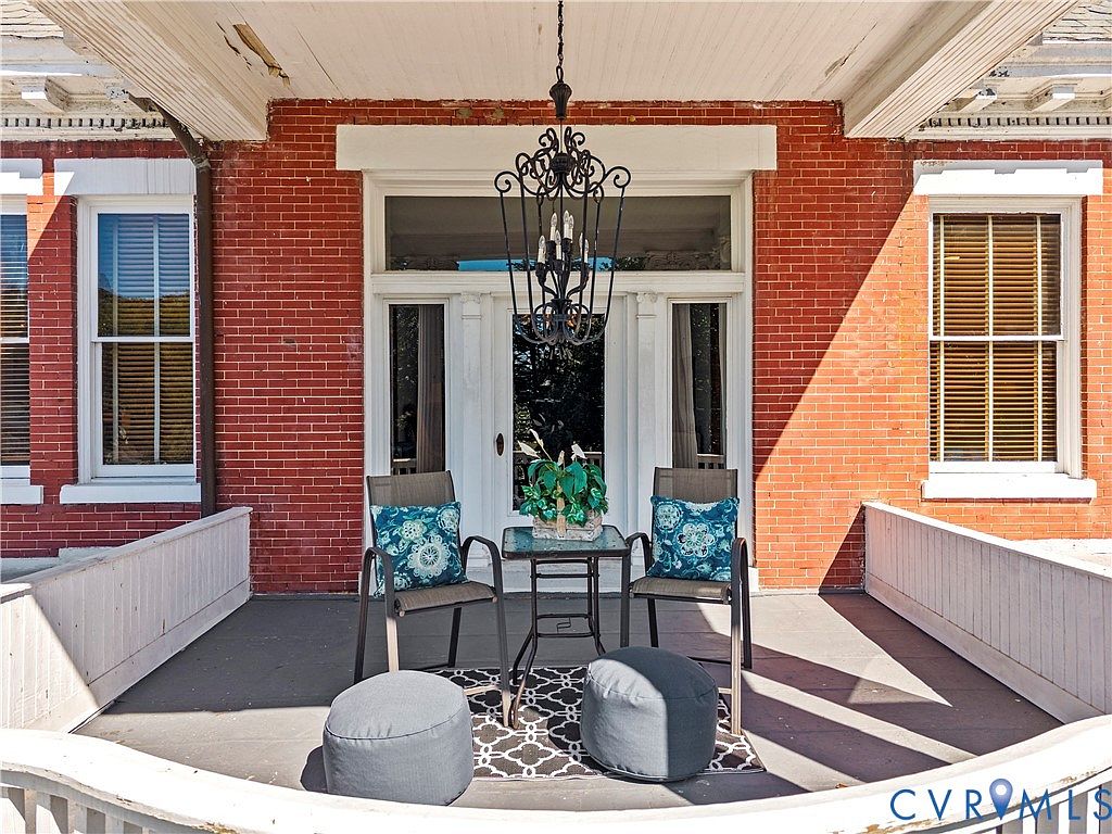 A welcoming porch area complements the classic American home, featuring rich red brick walls that create a warm ambiance. The space is accentuated by a stylish chandelier hanging elegantly from the ceiling, providing a touch of sophistication. Two comfortable chairs are paired with a chic glass table, inviting relaxation and conversation. Decorative pillows add a splash of color with geometric patterns, enhancing the aesthetic. Soft, round poufs offer additional seating or a footrest, making this an ideal family-friendly space. The muted gray flooring contrasts beautifully with the vibrant foliage of the potted plant, creating a harmonious outdoor retreat.