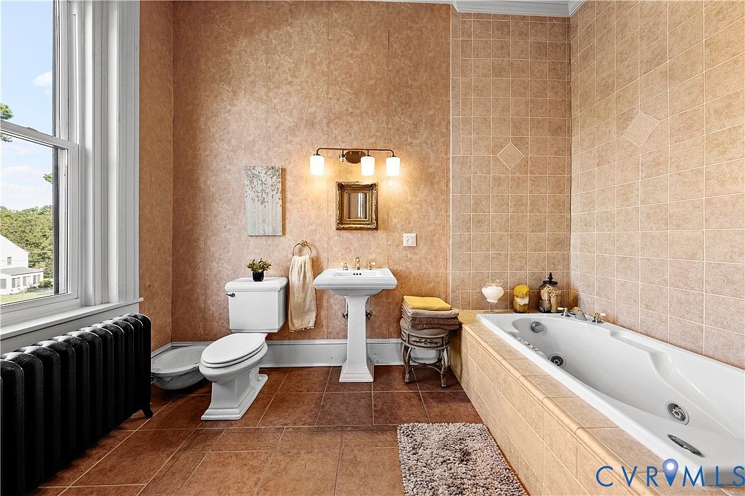 This elegantly designed bathroom exudes sophistication and comfort, featuring warm beige tones that create a calming atmosphere. The space incorporates a classic pedestal sink and a modern toilet, offering both style and functionality. A luxurious soaking tub provides a perfect retreat, surrounded by textured tile that enhances the aesthetic continuity. Soft lighting is provided by decorative sconces, while a vintage mirror adds character. The layout ensures ample natural light from a large window, paired with a practical black radiator for warmth. Finishing touches include plush towels and tasteful decor, creating a welcoming environment for family relaxation.