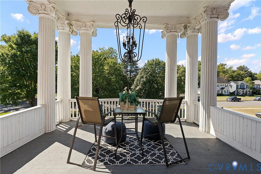This inviting porch showcases grand architectural details with tall, white columns and a stunning chandelier that adds elegance. The open layout features a stylish outdoor dining set, perfect for family gatherings. Cozy seating with soft cushions complements the chic black and white patterned rug, creating a warm, welcoming atmosphere. Lush greenery visible in the background enhances the sense of tranquility, making it an ideal spot for relaxation or entertaining. The combination of classic design elements and contemporary comfort highlights the versatility of this space, perfect for enjoying leisurely evenings or morning coffees amidst nature.