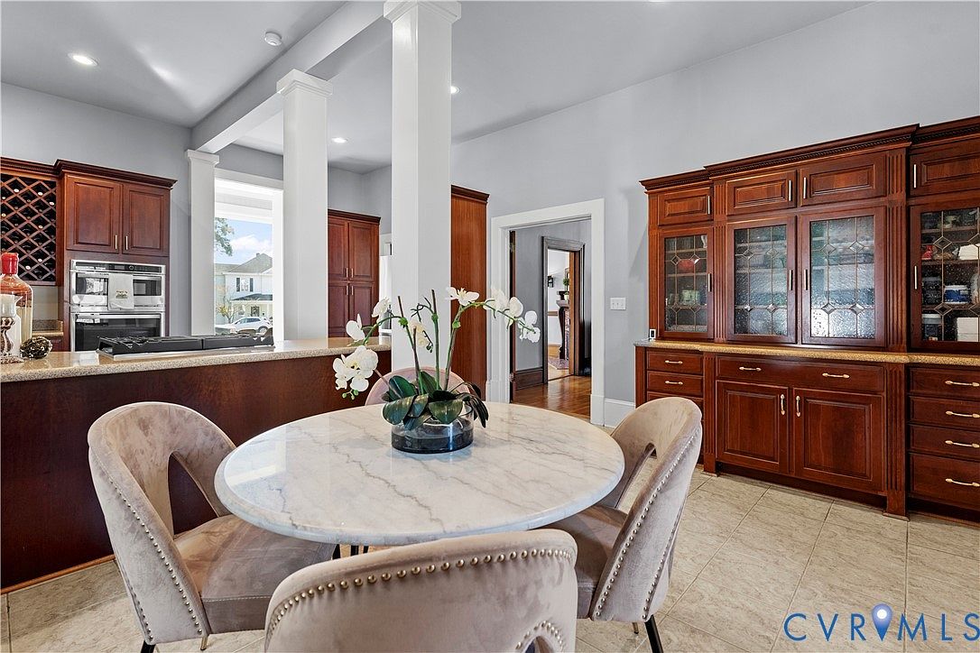 This inviting dining area seamlessly merges modern aesthetics with classic charm. Soft gray walls complement rich mahogany cabinets, creating a warm atmosphere. A round marble table, surrounded by plush, upholstered chairs, offers an intimate setting for family gatherings. Natural light floods the space through large windows, enhancing the bright ambiance. Architectural pillars add structure and elegance, while a glass-front pantry showcases stylish dishware. The meticulous detail of the cabinetry, featuring intricate glass accents and polished fixtures, merges functionality with beauty, making it an ideal spot for both casual meals and special occasions, designed for comfort and conversation.