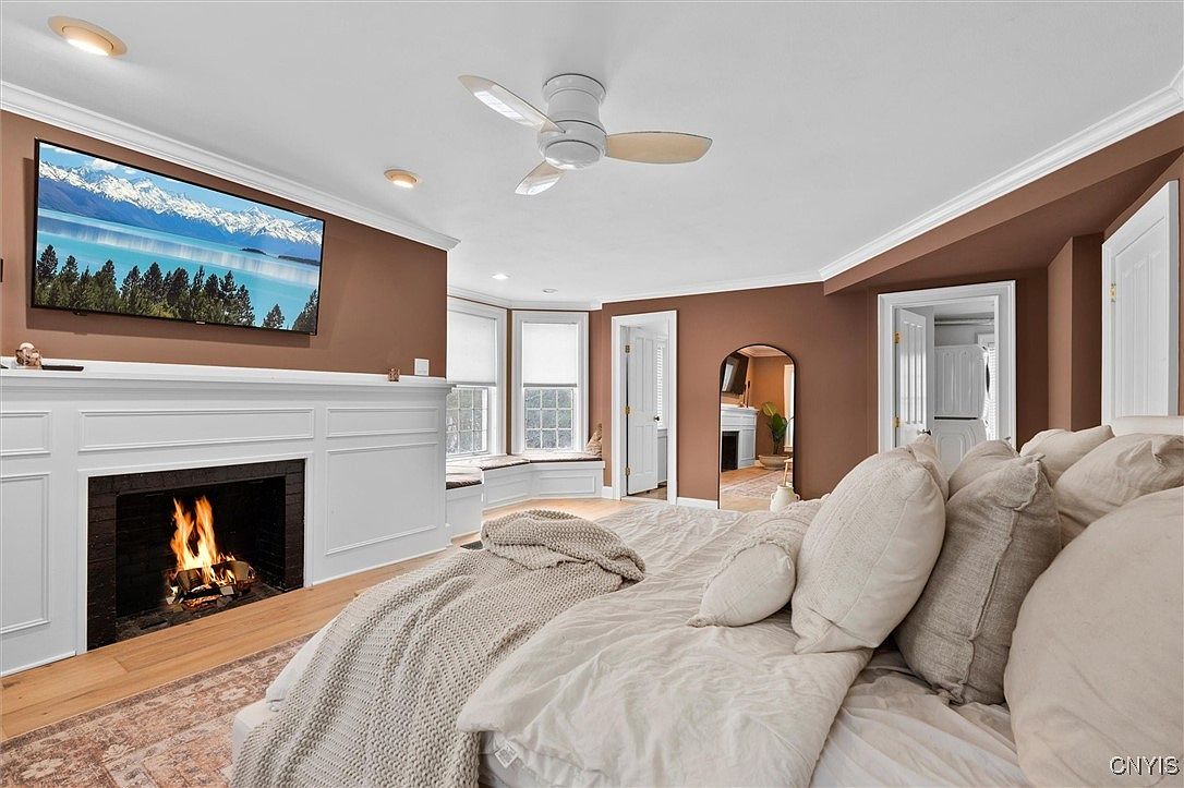 This inviting master bedroom features a cozy layout with a warm brown accent wall that complements the white trim and fireplace. The bed, adorned with fluffy pillows and a soft throw, creates a relaxed atmosphere. A mounted television above the elegant mantel adds a modern touch, while the fire flickering below invites comfort. Large windows allow natural light to illuminate the cozy reading nook, providing a perfect space to unwind. The rich color scheme and stylish architectural elements create a serene environment, ideal for relaxation and family gatherings. A door leads to an en-suite bathroom, enhancing convenience.