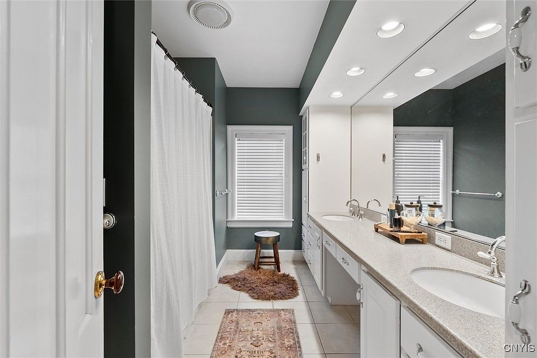 This bathroom features a harmonious blend of modern design and cozy comfort. The soft, muted color scheme, highlighted by a deep green accent wall, contrasts beautifully with the crisp white cabinetry. Dual sinks sit atop a smooth granite countertop, providing ample space for family use. Large mirrors reflect light, enhancing the airy feel, while recessed lighting ensures a bright atmosphere. A classic shower curtain offers privacy, alongside a plush area rug that adds warmth underfoot. The strategic window placement allows natural light to flood in, making it a functional yet serene retreat for all family members.