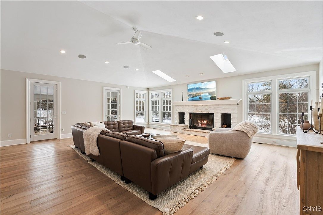 This spacious living room blends comfort and modern aesthetics, featuring a harmonious layout ideal for family gathering. Warm hardwood floors enhance the inviting atmosphere, complemented by a cozy brown leather sectional sofa and a soft, oversized chair, perfect for relaxing. A stunning stone fireplace serves as the room’s centerpiece, flanked by large panoramic windows that flood the space with natural light and offer views of the surrounding nature. Soft neutrals in the color palette create a tranquil backdrop, while recessed lighting and skylights add depth and brightness, making this an ideal space for entertaining or enjoying quiet family moments.
