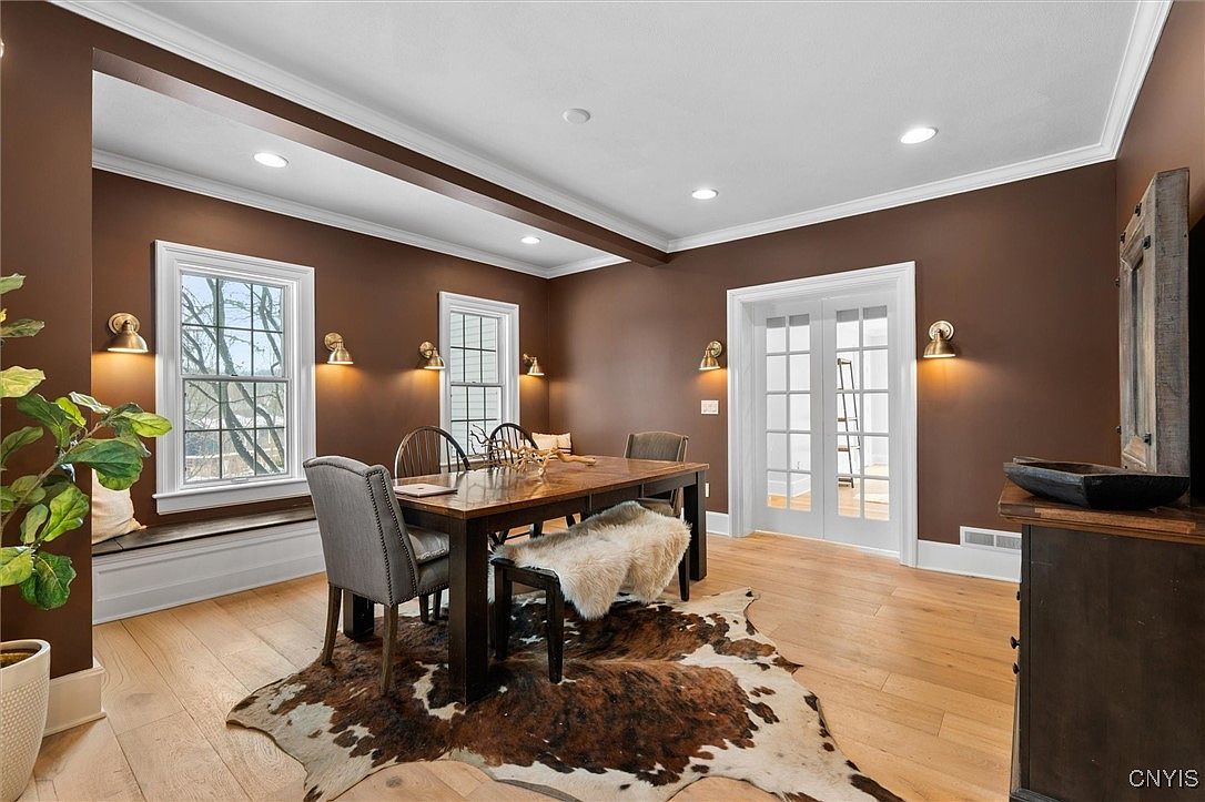 A stunning dining room exuding warmth and sophistication, featuring rich chocolate-brown walls that create an inviting atmosphere. The centerpiece is a sturdy wooden table surrounded by plush, gray upholstered chairs, ideal for family gatherings. A cozy built-in bench adds extra seating, while natural light streams through large windows, enhancing the inviting ambiance. Architectural details, such as crown molding and modern wall sconces, elevate the elegance. The juxtaposition of the light oak flooring with a stylish cowhide rug adds texture and comfort, making this space perfect for both formal dining and casual family meals.