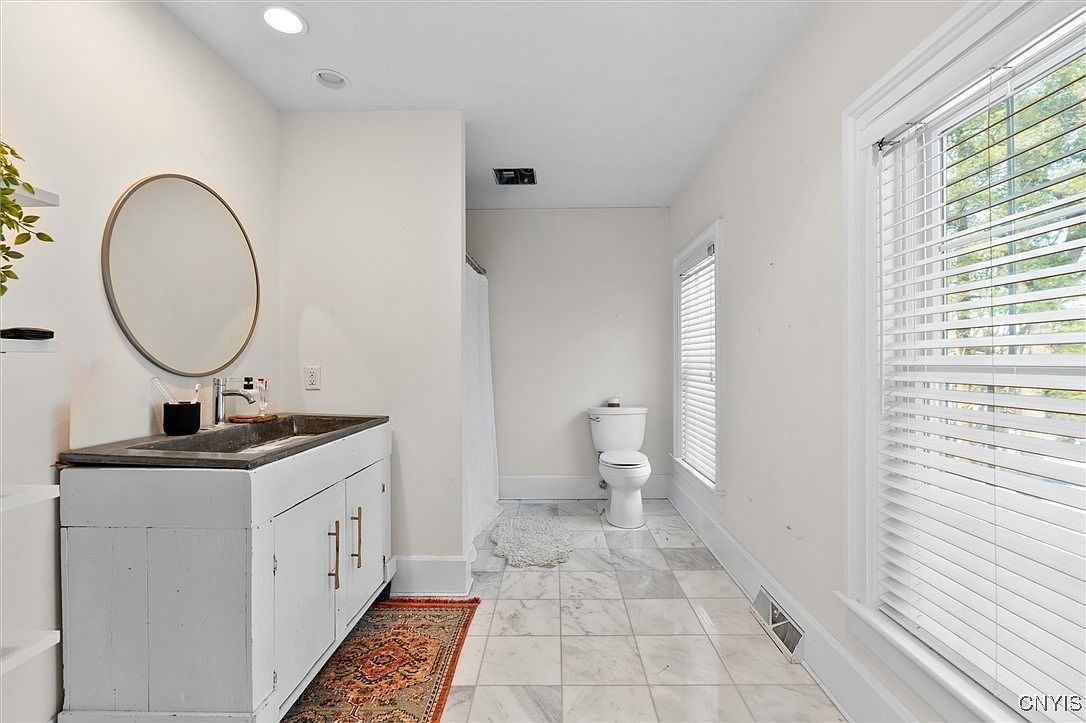 A bright, spacious bathroom featuring a modern design with minimalist elements. The room boasts a large marble floor that adds elegance, complemented by a sleek white vanity with a contrasting dark sink, providing ample storage. A round mirror enhances the spacious feel while the natural light pouring in from the window illuminates the space beautifully. Family-friendly features include a convenient layout and easy-to-clean surfaces. The subtle blend of white walls and warm wood accents create a calming atmosphere, while the classic addition of an area rug adds a touch of warmth, making it both functional and inviting.
