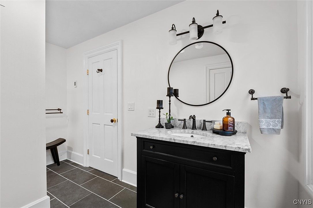 This elegant bathroom features a smooth black vanity topped with sleek white marble, enhancing its contemporary appeal. The large round mirror adds depth, while wall-mounted sconces illuminate the space with a warm glow. Dark slate flooring contrasts beautifully with the crisp white walls, creating a balanced and inviting atmosphere. Thoughtfully chosen accessories, including a decorative candle holder and stylish soap dispenser, complement the overall decor. A convenient towel rack and a sleek wooden bench provide both functionality and style, making this bathroom ideal for family use. The neutral color scheme promotes a serene, calming environment.