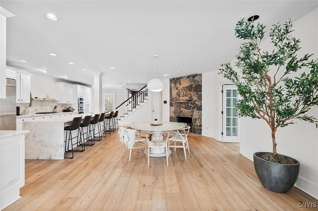 This inviting open concept kitchen exudes a modern, family-friendly atmosphere. The sleek white cabinetry complements the stunning marble countertops, while the spacious island offers casual seating with stylish bar stools. Adjacent, a charming dining area features a round wooden table surrounded by light, woven chairs, perfect for family gatherings. A floor-to-ceiling stone fireplace adds warmth and character to the space, enhancing the overall cozy ambiance. Natural light pours in through large windows, illuminating the warm hardwood floors. A touch of greenery from the potted plant adds a refreshing element, completing this elegant, welcoming home layout.