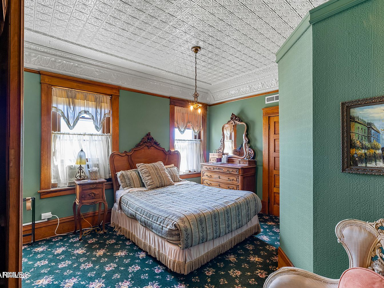 This welcoming bedroom exudes traditional charm with its sage green walls, ornate white tin ceiling, and richly grained wood trim framing the windows and doors. Plush, floral-patterned carpeting and vintage-style furnishing, including a carved headboard, matching dresser with mirror, and elegant nightstand, create a warm, cohesive atmosphere. Ample natural light filters through sheer, ruffled curtains, inviting a bright, airy feel while maintaining privacy. The thoughtful layout ensures space for restful sleep and relaxing family moments. Delicate accents and a decorative painting add historic character, making the room comfortable and inviting for both adults and children.