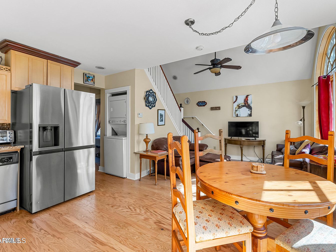 A bright open-plan space seamlessly connects the kitchen, dining, and living areas, creating an inviting and functional layout perfect for families. Blond wood cabinetry and sleek stainless steel appliances add a fresh, modern touch to the kitchen. A cozy dining area features a sturdy wooden table with cushioned, patterned chairs, situated near a large window that fills the room with natural light. The adjacent living area includes comfortable leather seating, a television, and tasteful artwork, all set against warm neutral walls. An eye-catching staircase and laundry nook enhance practicality, making the space ideal for daily family life and entertaining.
