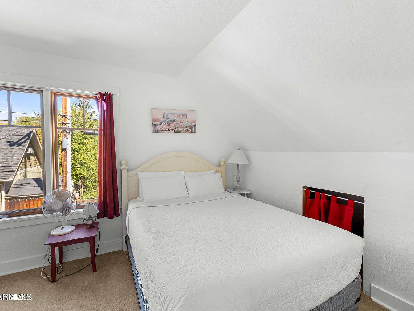 A charming bedroom with sloped ceilings creates an inviting sanctuary ideal for restful nights. The room features a queen-sized bed with a soft cream headboard, complemented by crisp white bedding, setting a light and airy tone. Natural light streams in from large windows dressed with deep red curtains, while a small side table and traditional lamp provide warmth and practicality. Neutral-toned carpeting adds comfort underfoot. Subtle decor, including a floral painting above the bed and a playful small curtained nook, makes this room both family-friendly and welcoming, offering a peaceful retreat suitable for all ages.