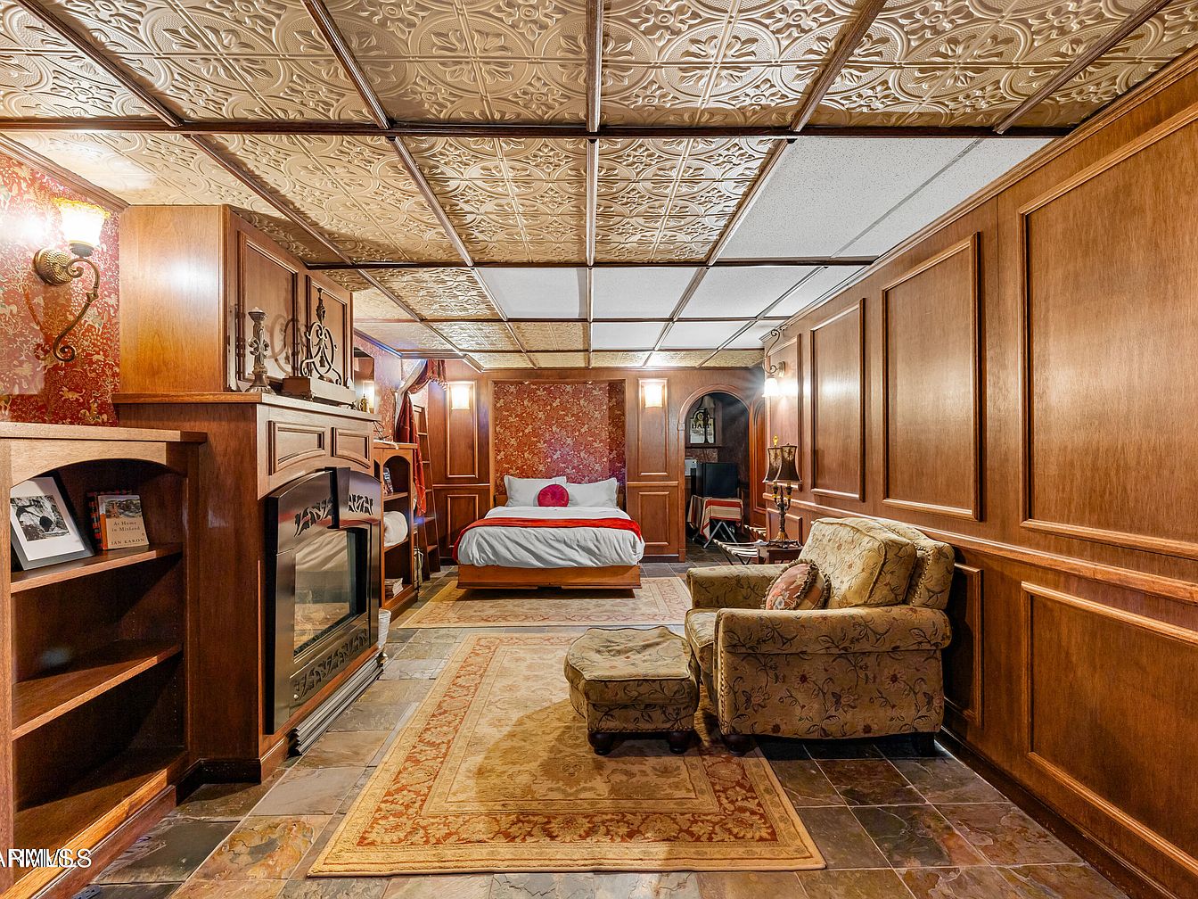A warm and inviting basement suite boasts rich wood paneling on the walls and ornate, patterned tin ceiling tiles that add vintage charm. The heart of the space features a cozy lounging area with an upholstered armchair and ottoman, perfect for family relaxation. A prominent stone-tiled fireplace divides the living and sleeping zones, while inset bookcases offer convenient storage. The queen-sized bed at the far end is dressed in crisp white linens with red accents, paired with warm, ambient wall sconces. The overall palette of deep woods, golden bronze, and soft earth tones creates a comfortable and classy family-friendly environment.