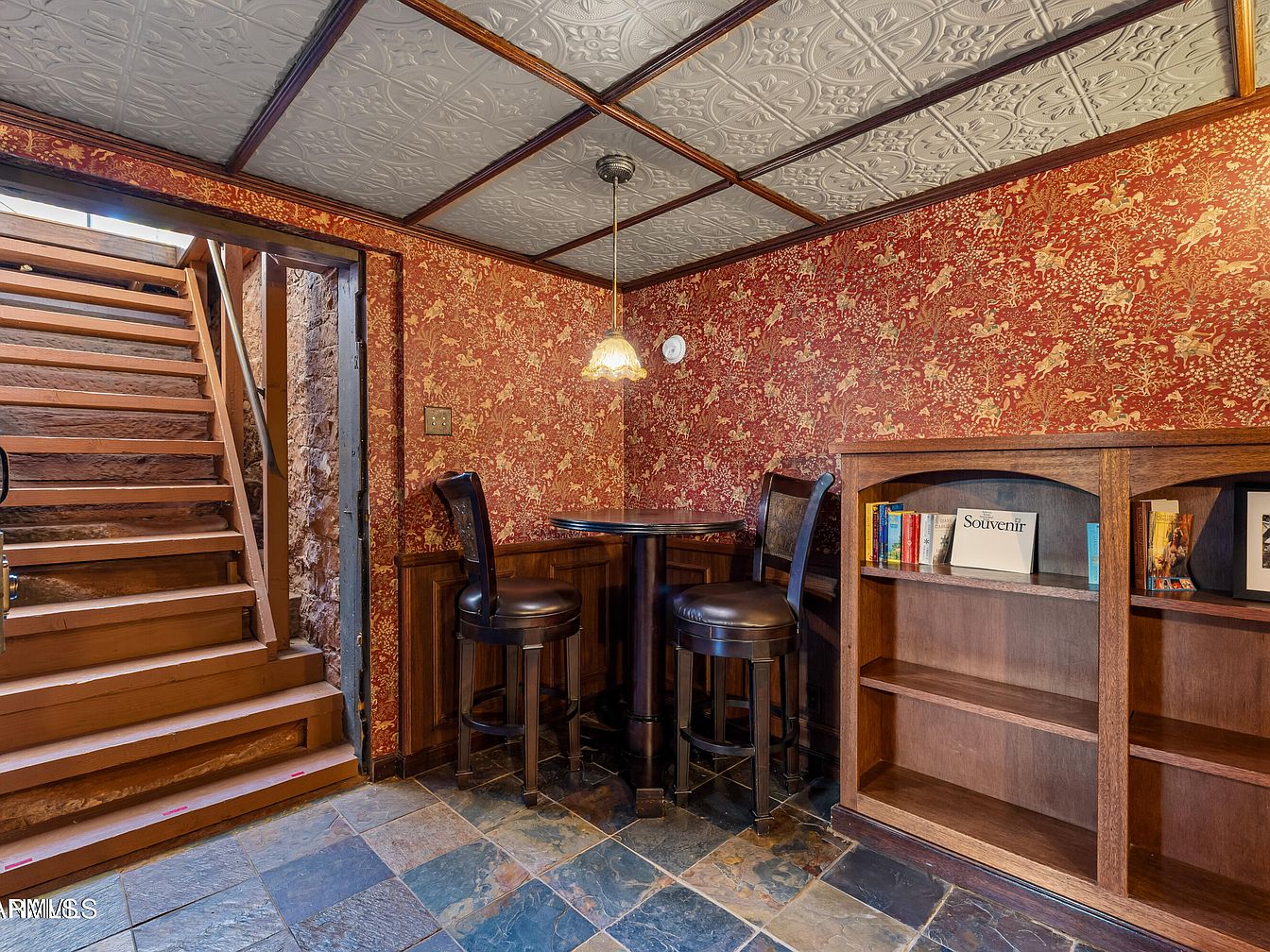 A charming reading nook nestled at the base of a wooden staircase creates a warm, inviting atmosphere for family gatherings or quiet moments alone. Slate tiled floors add durability and character, while dark wood bookcases provide ample storage for books and treasures. A small round table with two leather-upholstered chairs offers a comfortable spot for card games or study sessions. The rich red patterned wallpaper pairs beautifully with paneled wainscoting, lending a sense of timeless elegance. A pendant light with a vintage glass shade finishes the space, making it perfect for kids and adults to relax and connect.