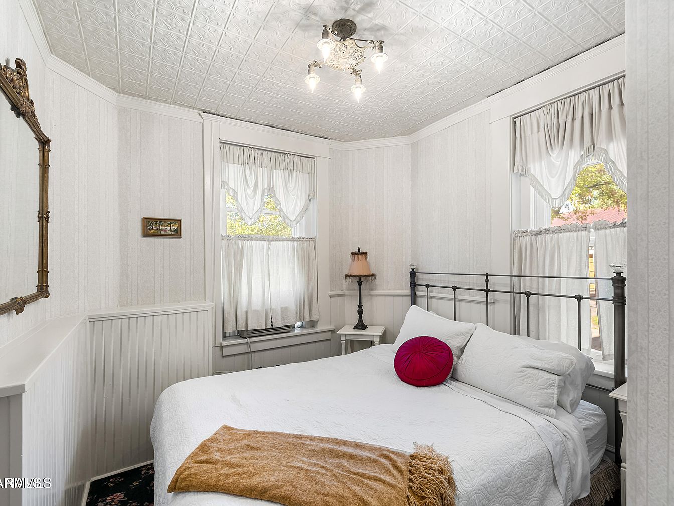 A charming bedroom exudes inviting warmth with its vintage-inspired décor and soft color palette. Paneled wainscoting and textured wallpaper complement the classic white pressed-tin ceiling, while the large double windows with tiered drapes fill the space with natural light. The bed, featuring a timeless wrought iron frame, creates a welcoming focal point, accentuated by plush pillows and a vibrant accent cushion. Antique lamps atop matching bedside tables add a subtle touch of elegance. This space is ideal for families, offering comfort, ample daylight, and a peaceful atmosphere that encourages relaxation and restful sleep.