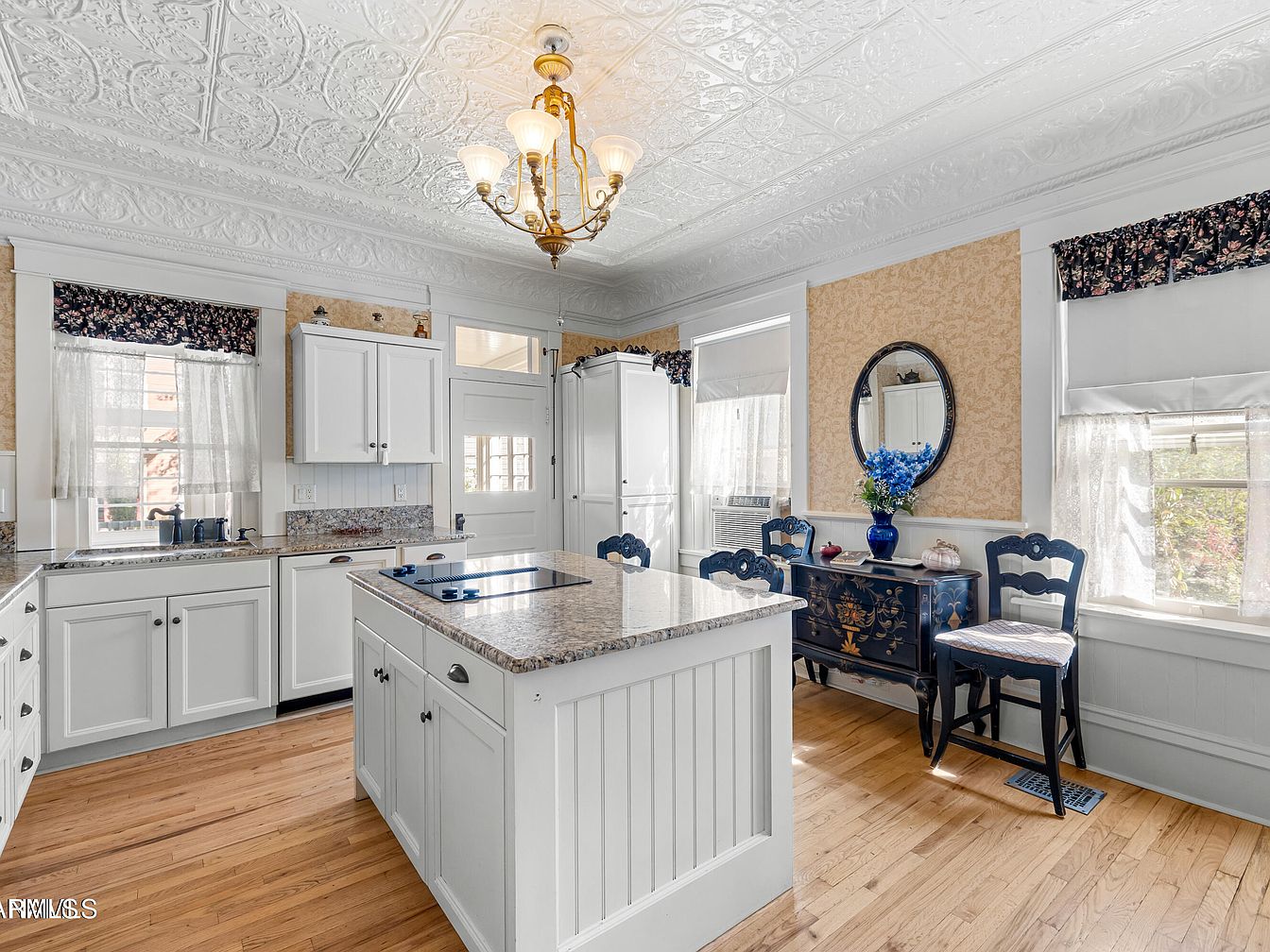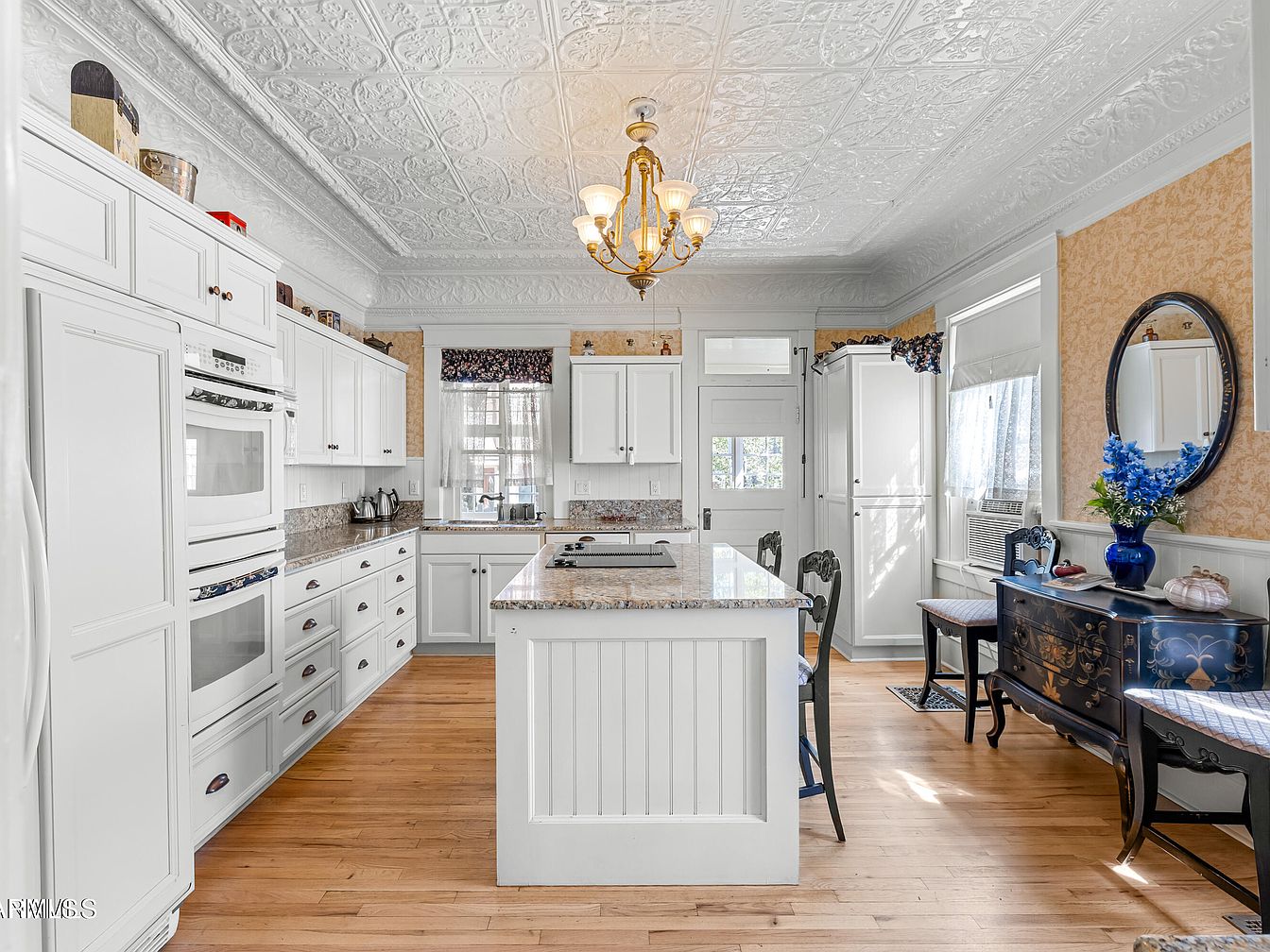 A bright and inviting kitchen features a spacious center island with granite countertops, ideal for both meal prep and casual family gatherings. Crisp white cabinetry with classic hardware pairs beautifully with light hardwood floors, offering a timeless charm. The ornate tin ceiling and elegant chandelier add a vintage touch, balancing well with the soft gold patterned wallpaper and floral window treatments. Multiple windows allow natural light to flood the room, creating a cheerful atmosphere. Handy seating along the island and a decorative sideboard with navy blue chairs provide practical family-friendly spaces for dining, homework, or conversation.