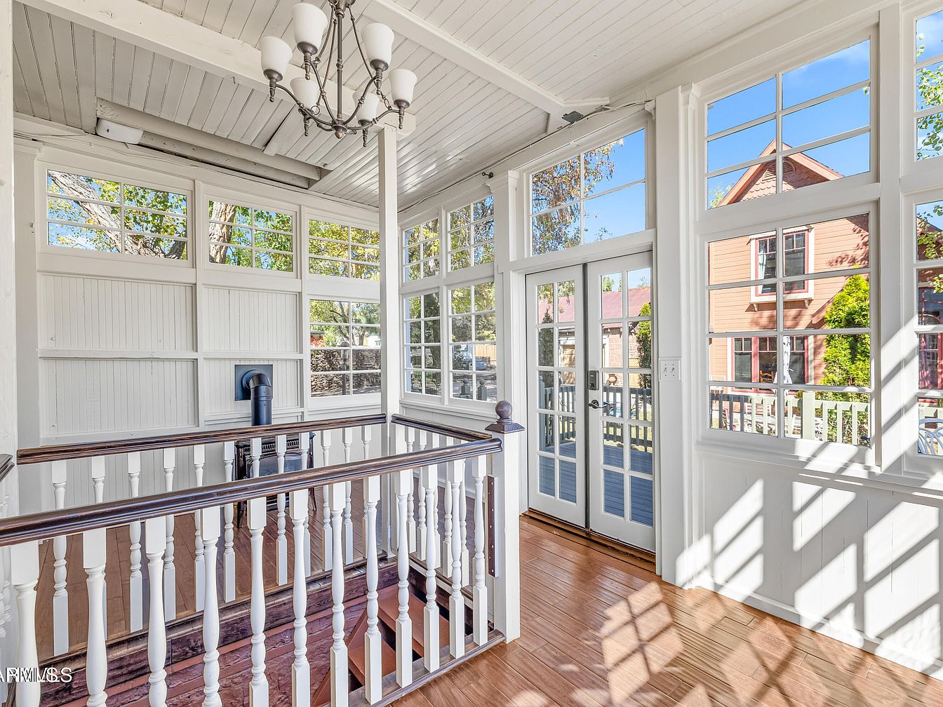 Bright and airy, this enclosed porch is designed with an abundance of large windows allowing natural light to flood the space and offering scenic views of the surrounding yard. The room features crisp white paneled walls and ceiling, paired with intricate wooden railings and rich wood flooring that enhance its inviting and classic appeal. A decorative chandelier adds a touch of elegance, while the glass-paneled double doors provide seamless indoor-outdoor flow, perfect for family gatherings or a children’s play area with plenty of supervising visibility. The timeless color palette and functional layout create a versatile, family-friendly retreat.