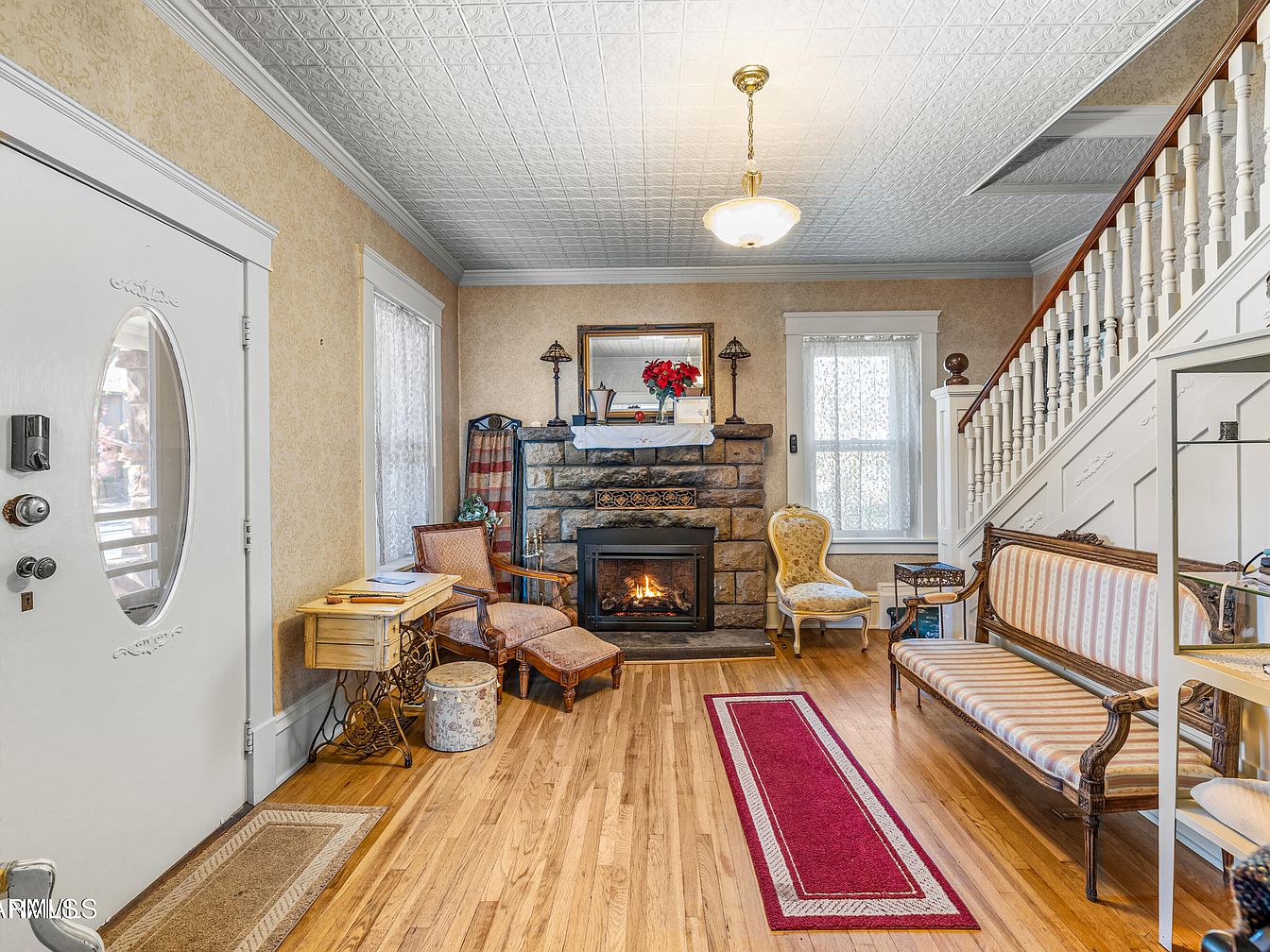 A welcoming foyer blends classic charm with cozy family living, centered around a stone fireplace that invites guests to gather. The space features warm hardwood flooring and an elegant white staircase with intricate woodwork. Vintage-style seating, including a settee and upholstered chairs, offers both comfort and sophistication, complemented by a red runner that adds a pop of color. Soft neutral wallpaper and lace curtains provide a gentle, homey backdrop, while family-friendly touches like reading nooks and sturdy furniture make it ideal for both relaxing and entertaining. A high, patterned ceiling and decorative details complete the timeless appeal.