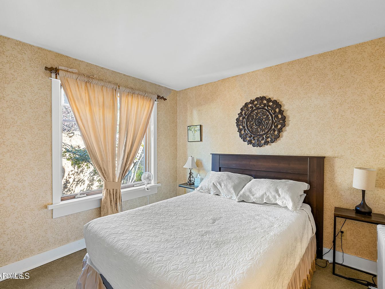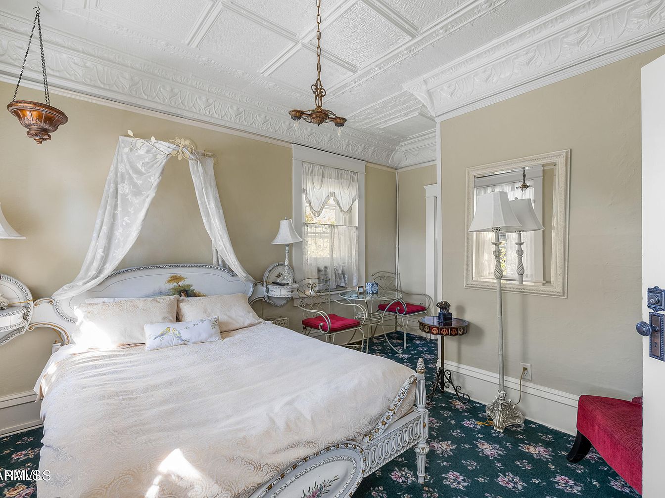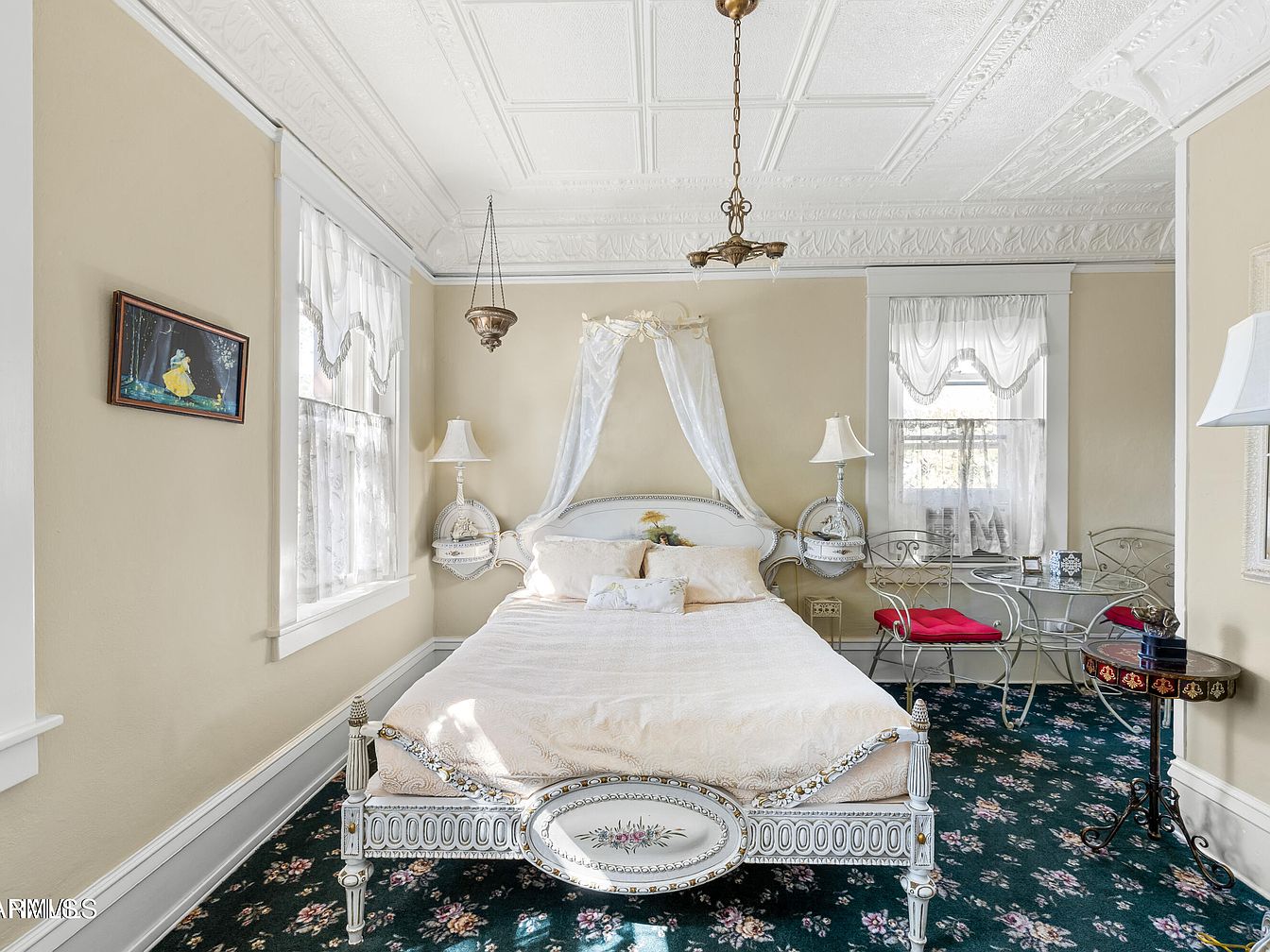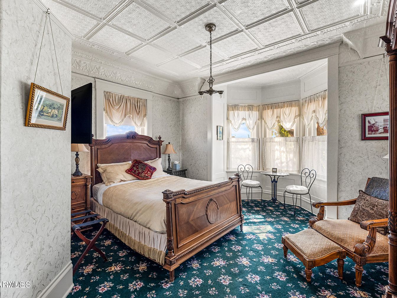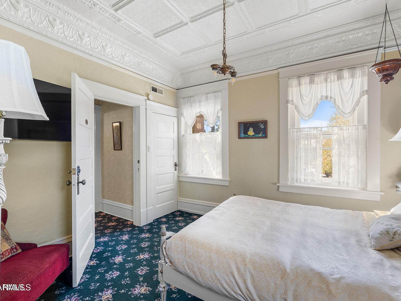 This welcoming bedroom exudes traditional charm with its sage green walls, ornate white tin ceiling, and richly grained wood trim framing the windows and doors. Plush, floral-patterned carpeting and vintage-style furnishing, including a carved headboard, matching dresser with mirror, and elegant nightstand, create a warm, cohesive atmosphere. Ample natural light filters through sheer, ruffled curtains, inviting a bright, airy feel while maintaining privacy. The thoughtful layout ensures space for restful sleep and relaxing family moments. Delicate accents and a decorative painting add historic character, making the room comfortable and inviting for both adults and children.
