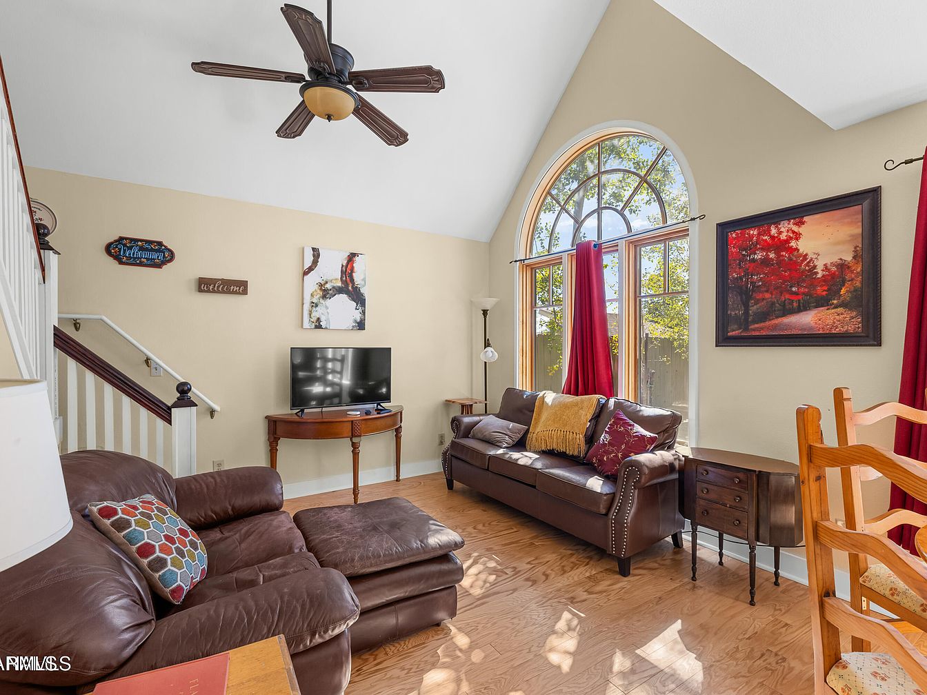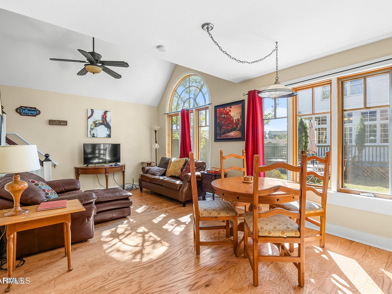 An inviting open-concept living and dining space featuring a vaulted ceiling and abundant natural light from large windows and a dramatic arched transom. Warm wood flooring runs throughout the room, complementing classic brown leather sofas and light wooden dining set. Pops of color from red curtains, lively wall art, and decorative pillows add a cheerful touch. The seating area is centered around a flat-screen TV, perfect for family movie nights, while the round dining table accommodates four for meals or games. The family-friendly layout encourages gathering, with sightlines to the backyard and adjacent kitchen, fostering a sense of togetherness.