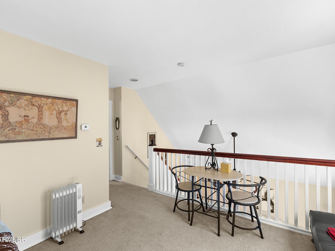 A cozy loft overlooks the lower level, offering a quiet and inviting nook perfect for reading, games, or family conversation. The simple round table and metal chairs provide a spot for casual meals or studying, while the soft beige carpeting and matching wall color create a soothing atmosphere. Decorative touches include a whimsical framed print, a modern lamp, and a radiator for added comfort. The white spindled railing with wood trim adds architectural interest and ensures safety, making this a family-friendly space where children can play or adults can relax in a bright, open setting.