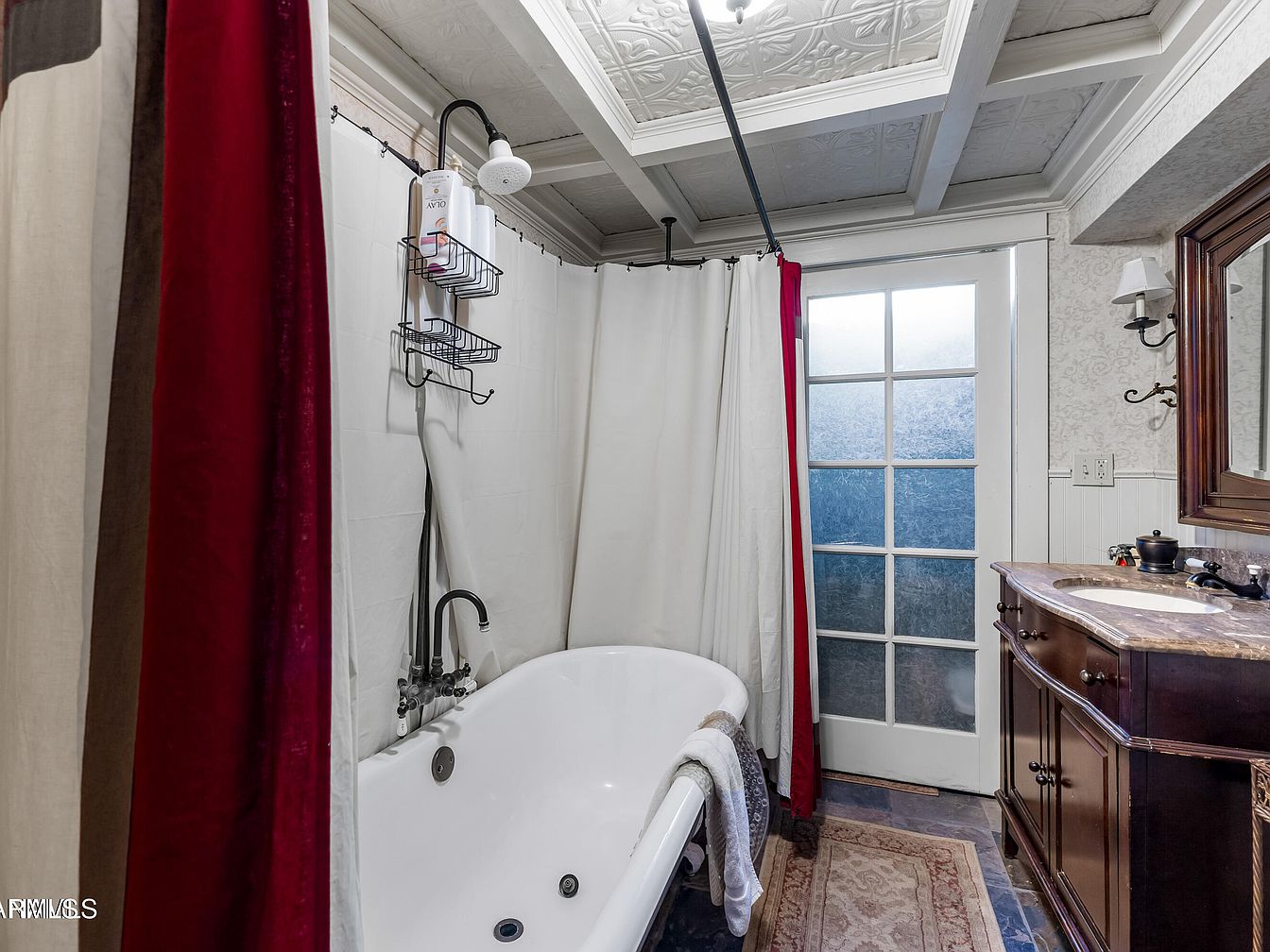This inviting bathroom features a classic clawfoot bathtub with elegant fixtures, perfect for relaxing after a long day. The room’s design is anchored by a coffered ceiling with intricate tin tiles, adding a touch of vintage charm and architectural interest. Warm wood tones from the vanity and mirror frame are complemented by the subtle wallpaper and white wainscoting, creating a harmonious balance between cozy and refined. A French-style frosted glass door allows plenty of natural light while preserving privacy. Practical storage solutions, like over-tub shower racks and wide countertops, make this space functional and family friendly.