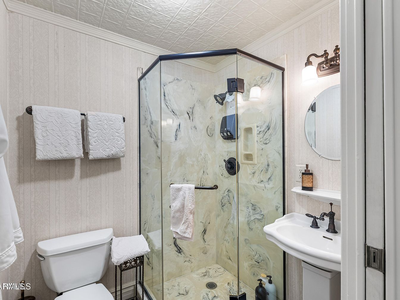 A beautifully arranged bathroom corner features a walk-in glass shower with elegant marble-like walls and dark metal hardware, creating a timeless and clean look. The compact pedestal sink pairs with an oil-rubbed bronze faucet, illuminated by a vintage-inspired light fixture above a round mirror. Soft, patterned white towels hang nearby, enhancing the room’s airy, inviting atmosphere. Soft, vertical textured wallpaper and a detailed tin ceiling offer subtle vintage charm, making the space both family friendly and stylish. The well-organized layout maximizes usability, ensuring comfort for daily routines while maintaining a fresh, classic aesthetic ideal for any home.