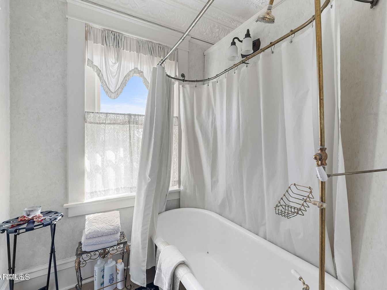 A charming bathroom showcases a vintage-style clawfoot tub with a wrap-around shower curtain suspended from a brass rail, evoking classic elegance. Soft, neutral walls and ornate ceiling trim add period character to the space. Natural light streams through a large window dressed in semi-sheer lace curtains and a decorative valance, creating an airy, inviting atmosphere. Practical surfaces, such as a wrought iron towel rack and a petite folding table, keep essentials neatly organized, making the room family-friendly. The gentle color palette and use of light, decorative textiles offer a relaxing sanctuary for everyone in the home.
