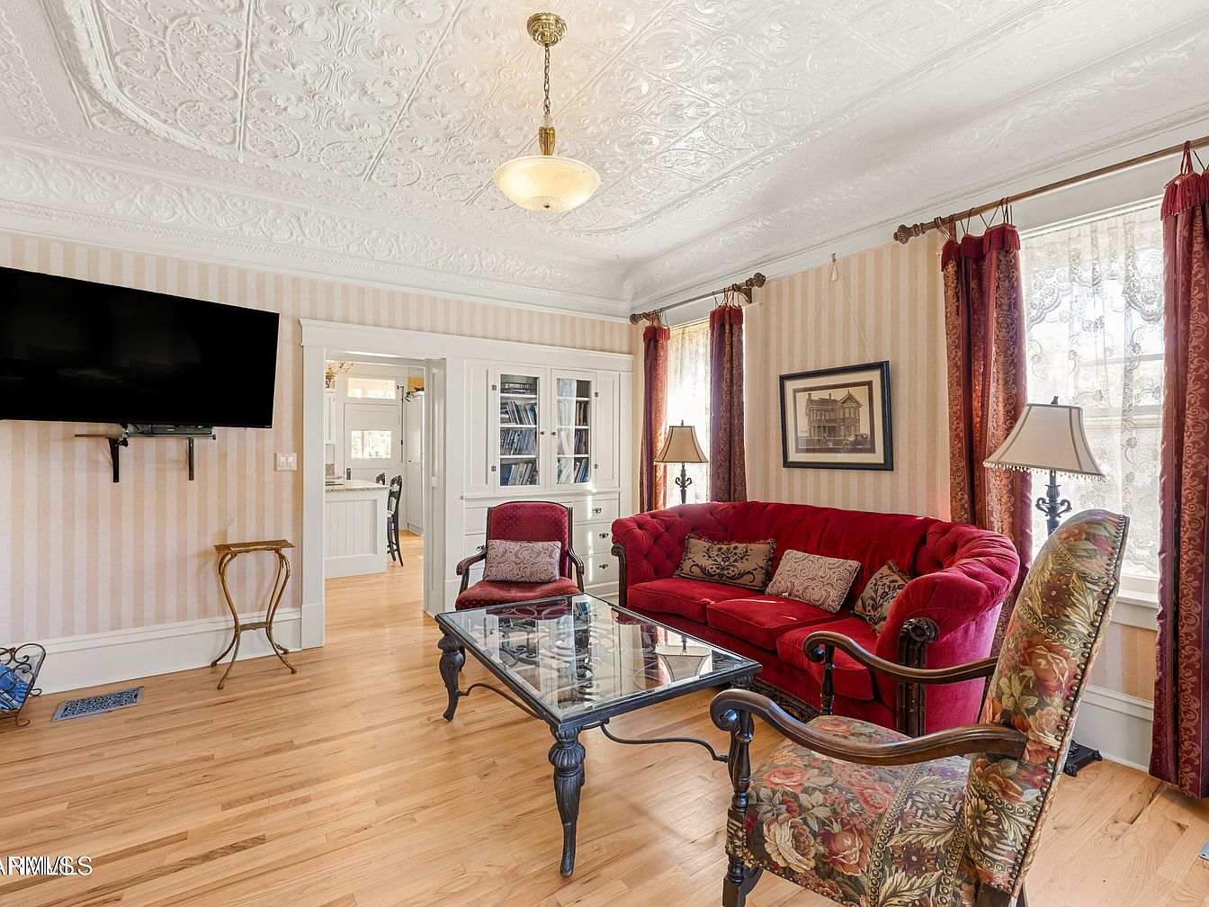 A welcoming living room blends classic warmth and elegance, boasting an ornate pressed tin ceiling and intricate crown moldings. Sunlight streams through tall windows dressed in sheer lace curtains and rich, patterned drapes, illuminating the soft, striped wallpaper. The focal point is a deep crimson velvet sofa adorned with decorative pillows, complemented by a floral-upholstered armchair and a glass coffee table with wrought iron legs. The hardwood flooring offers durability for family gatherings, while ample built-in cabinetry provides storage and display space. This cozy yet sophisticated space is ideal for relaxing together or entertaining guests in style.