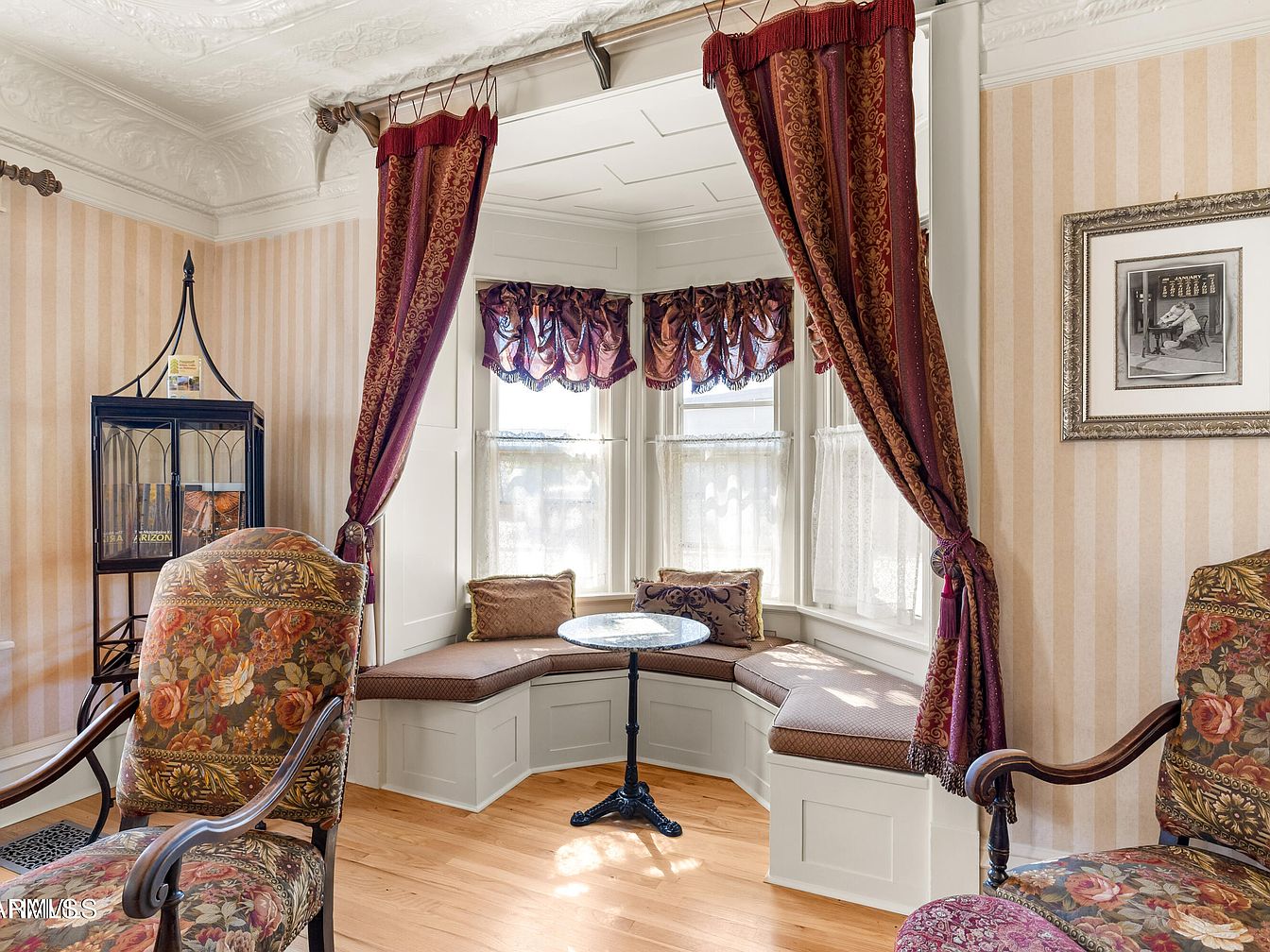 A charming bay window nook creates an inviting spot for intimate family gatherings or quiet moments with a book. The window seating is designed with cushioned benches and matching throw pillows, offering comfort and a view of the outdoors. Elegant burgundy and gold drapes, paired with valanced curtains, frame the windows and add warmth to the space. The area features delicately patterned wallpaper in soft cream and tan stripes, which enhances the room’s period character. Ornate armchairs with floral upholstery and a small round table create a cozy yet refined atmosphere, perfect for both relaxation and conversation.