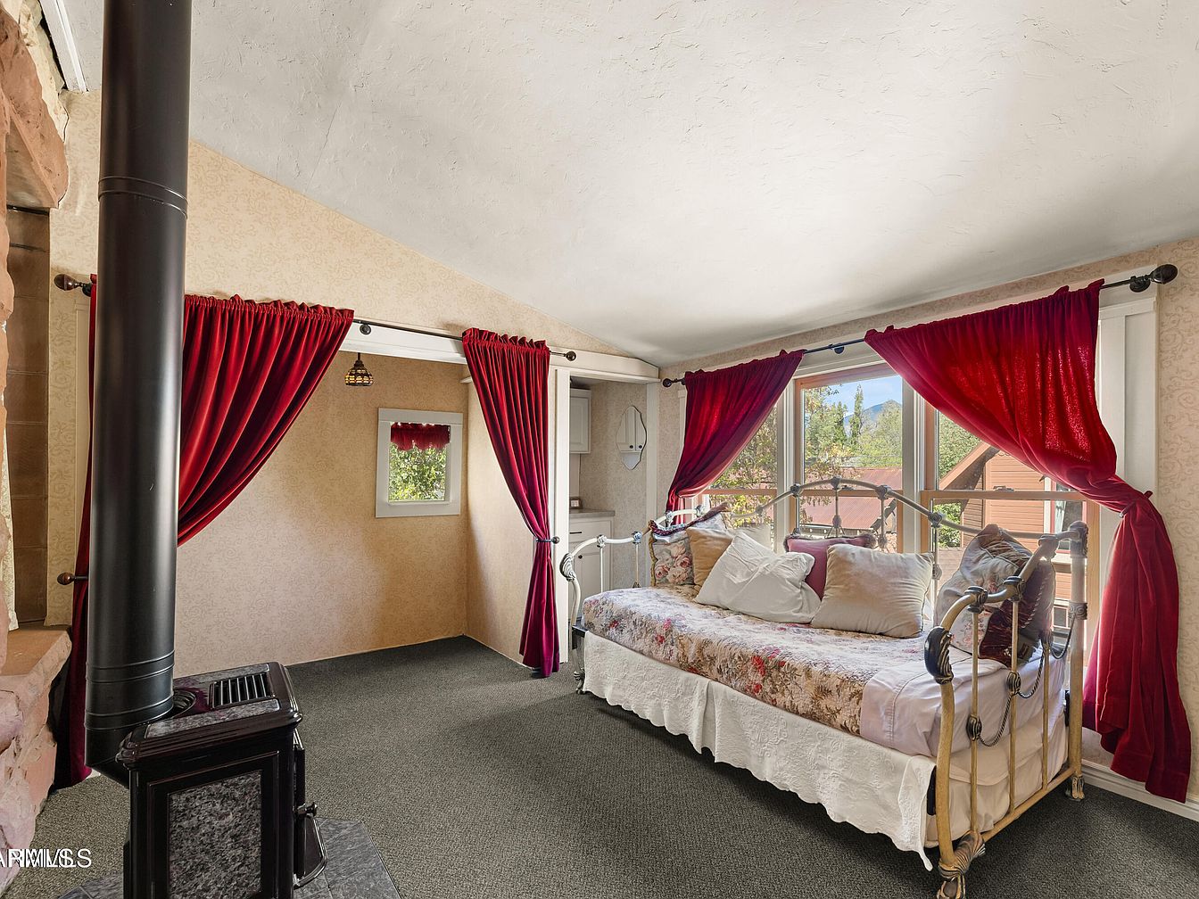 A charming corner bedroom space features a cozy daybed adorned with plush pillows and a floral coverlet, positioned beside expansive windows that fill the room with natural light. Deep red velvet drapes frame the windows, adding a touch of drama and warmth to the neutral wallpaper and soft gray carpet. A black wood-burning stove set against a rustic stone surround enhances the room’s inviting atmosphere, making it perfect for families to unwind together. Carefully selected vintage furnishings and delicate accessories complement the traditional character, while the open layout ensures comfort and functionality for daily family living.