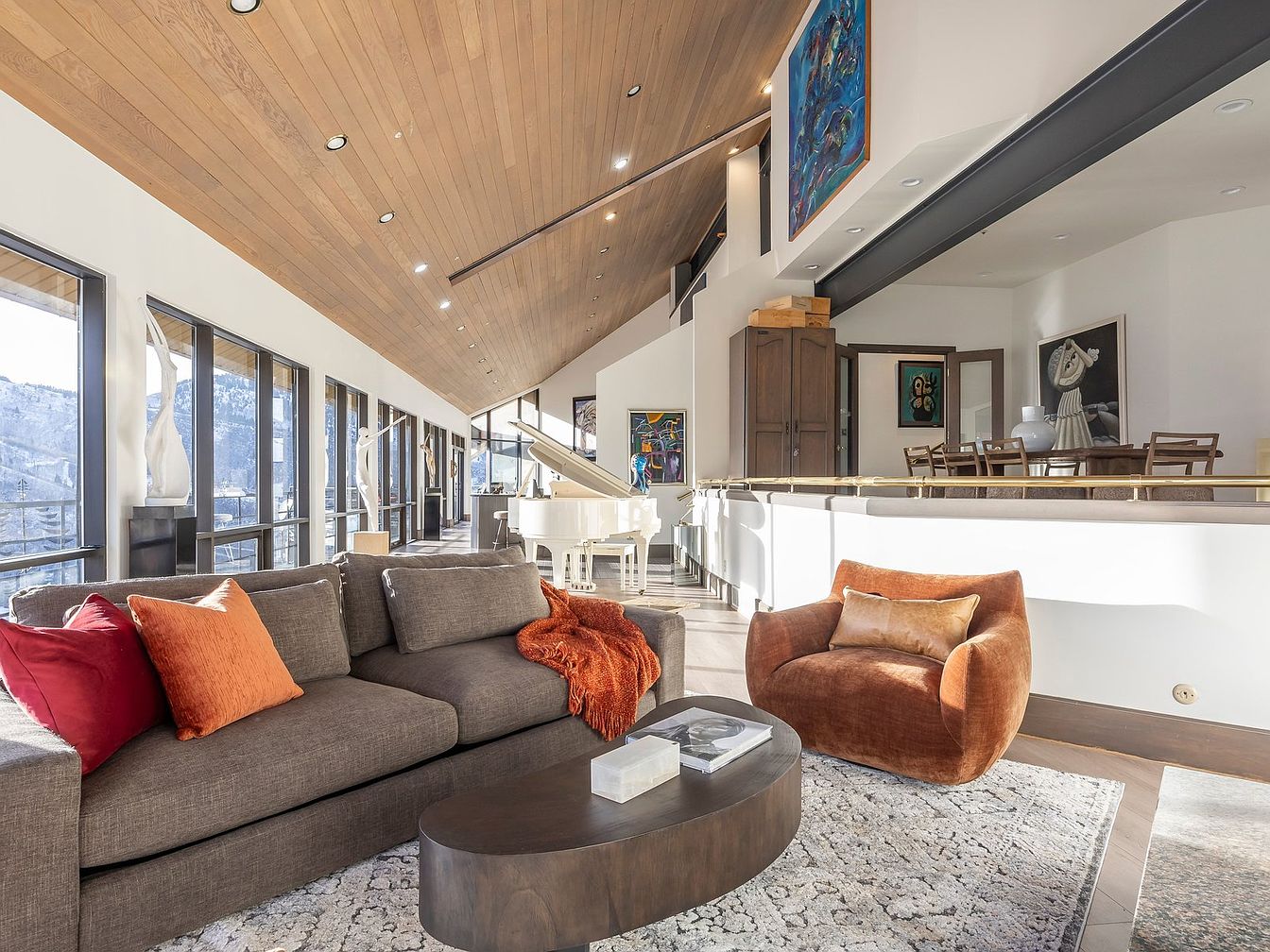 This stunning living room features soaring ceilings with warm wooden beams that create a spacious and inviting atmosphere. Expansive windows flood the area with natural light, highlighting the breathtaking mountain views. A plush gray sectional, adorned with vibrant red and orange cushions, invites relaxation, while a cozy rust-colored chair adds a pop of color. The low-profile coffee table in rich wood complements the textures around it. Artistic pieces decorate the walls, adding character without compromising the overall harmony. Family-friendly, this space encourages gathering and conversation, seamlessly connecting to a stylish dining area, enhancing its welcoming ambiance.