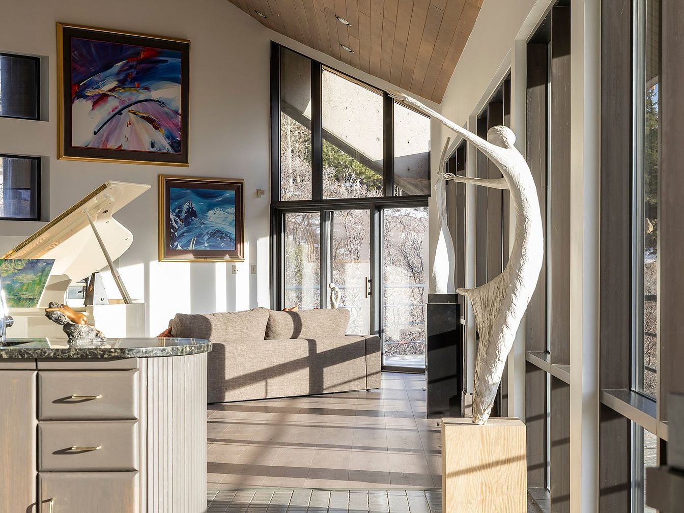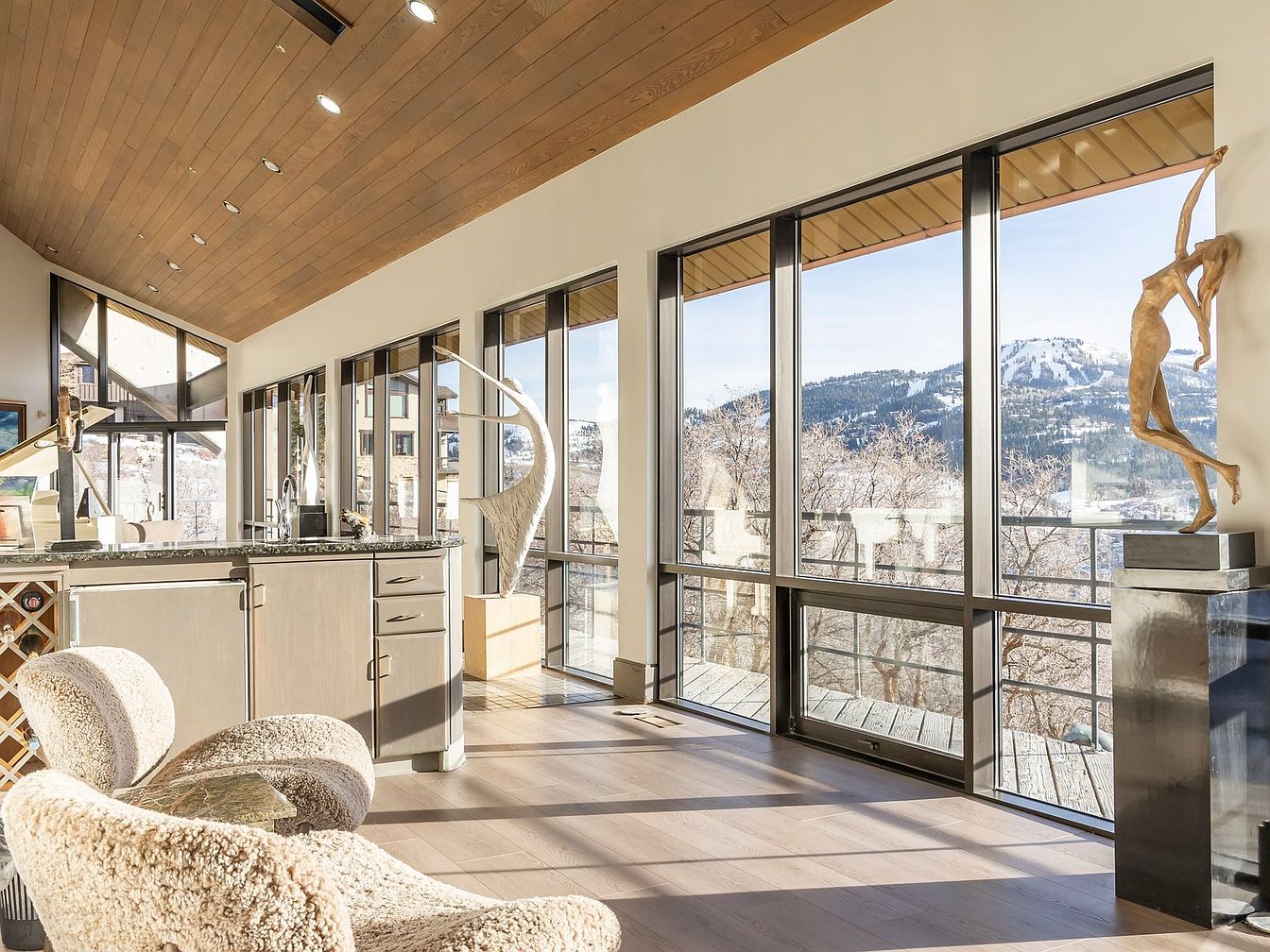 This contemporary living space features soaring ceilings and expansive windows that flood the room with natural light, providing breathtaking mountain views. A warm wood ceiling contrasts beautifully with sleek, minimalist furniture, including a textured chair that adds comfort and style. The open layout promotes family interaction, allowing for easy movement between lounging and entertaining areas. Subtle earth tones in the décor harmonize with the surroundings, while elegant art pieces, like the dynamic sculpture, introduce a touch of sophistication. The polished floor complements the modern aesthetic, making this space ideal for relaxation or social gatherings.