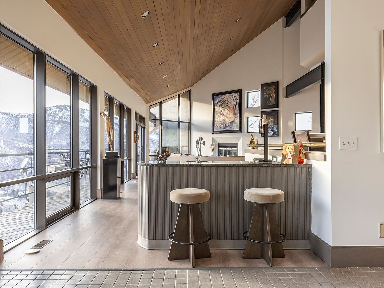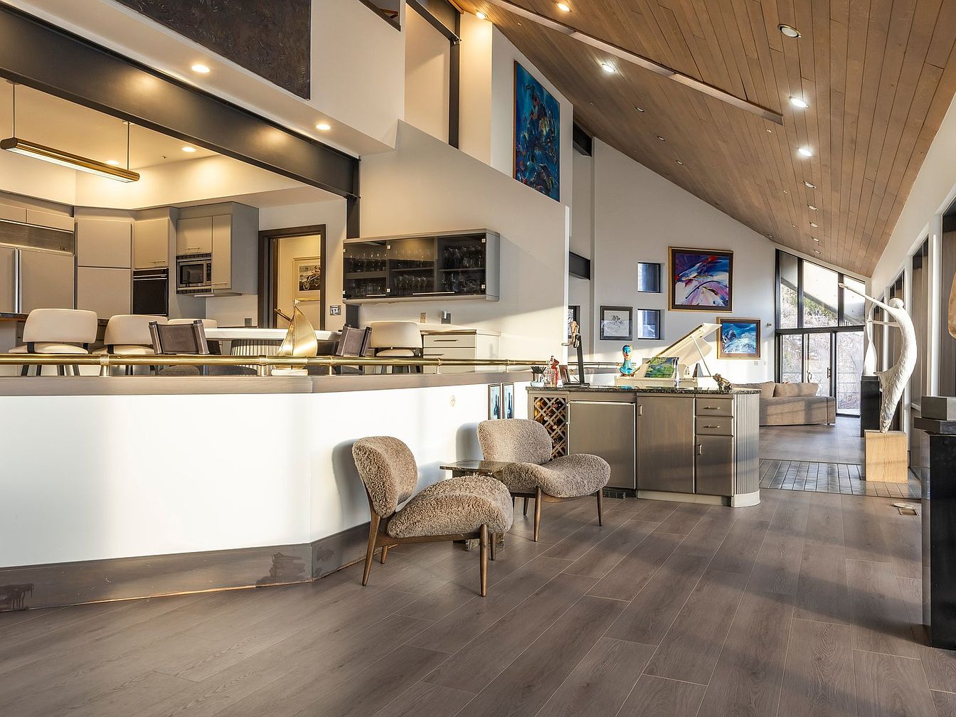 This open concept kitchen effortlessly combines functionality and elegance, featuring a sleek, curved bar with textured panels complemented by plush, comfortable stools. Floor-to-ceiling windows invite natural light and provide stunning mountain views, enhancing the spacious feel. A warm wooden ceiling adds a touch of rustic charm, harmonizing with contemporary art pieces that adorn the walls. The modern cabinetry and minimalist design maintain a clean aesthetic, while adaptable spaces cater to family gatherings and entertaining. Neutral tones combined with subtle accents create a relaxing atmosphere, making this kitchen a perfect blend of style and practicality for everyday living.