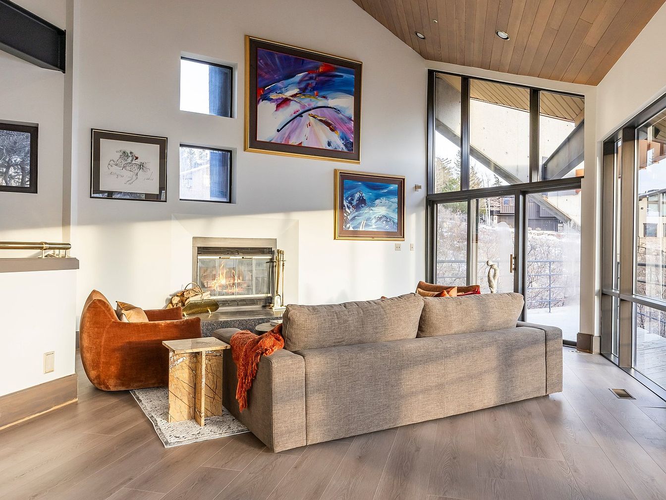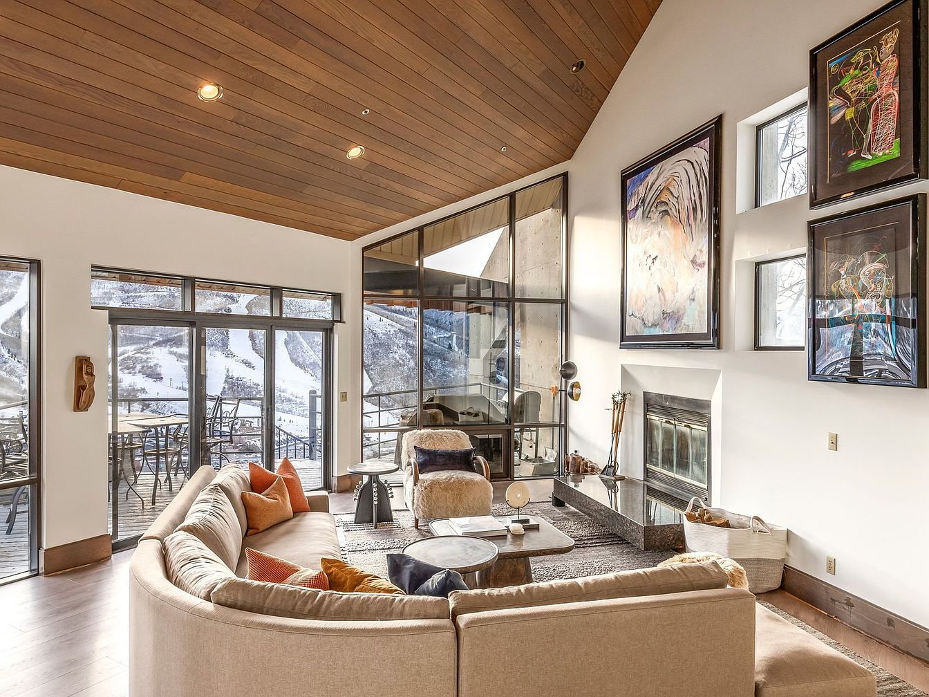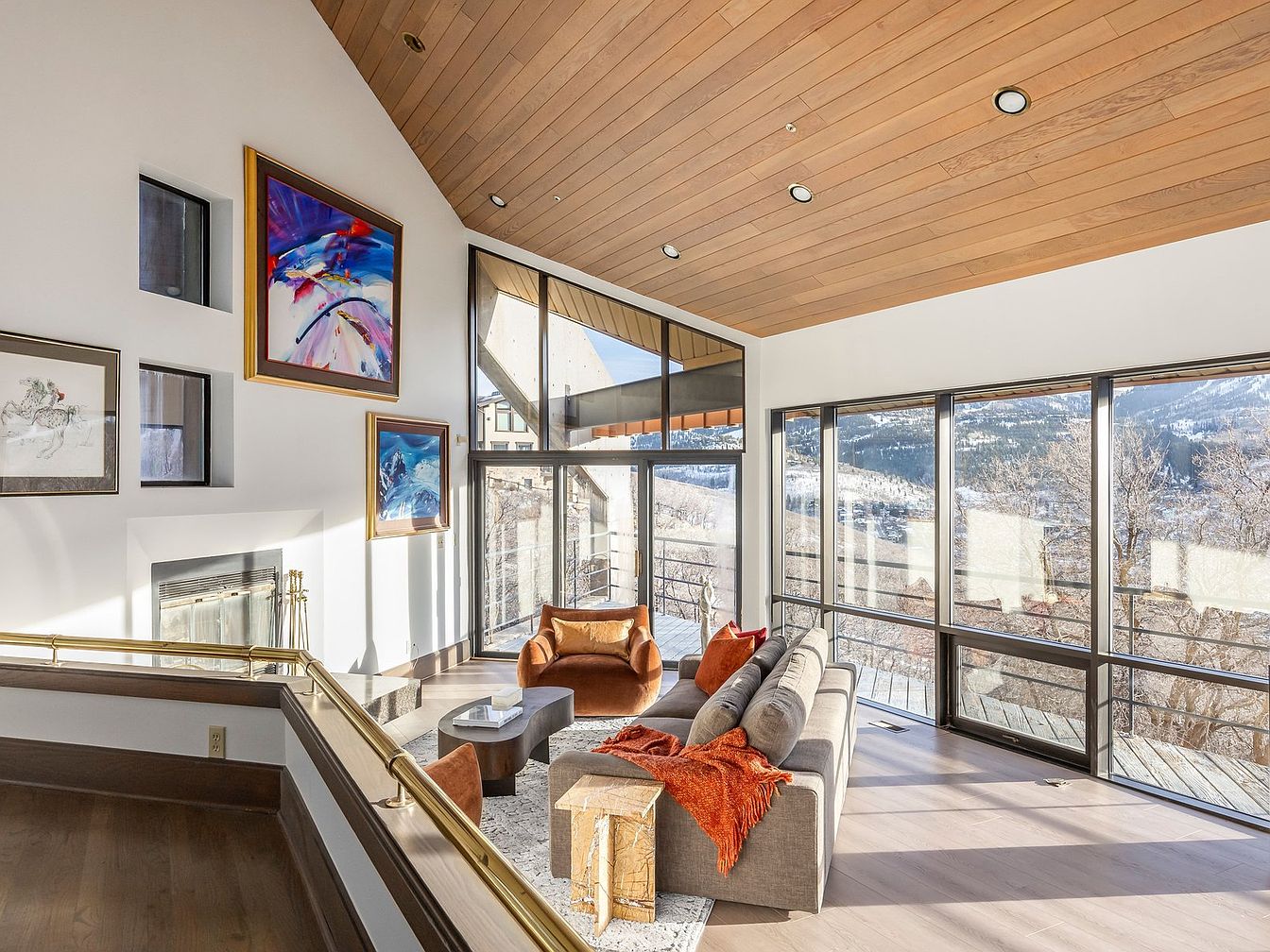 This spacious living room boasts a stunning combination of modern design and cozy aesthetics. High, vaulted wooden ceilings enhance the airy feel, while large floor-to-ceiling windows flood the space with natural light and showcase breathtaking mountain views. The inviting seating area features a plush gray sofa adorned with vibrant throw pillows and a rich, textured throw that adds warmth. Accented with an elegant wooden coffee table and a stylish armchair, the layout promotes family interaction. Artwork adorns the walls, adding color and personality, while the sleek fireplace offers a charming focal point for gatherings, creating a welcoming atmosphere.
