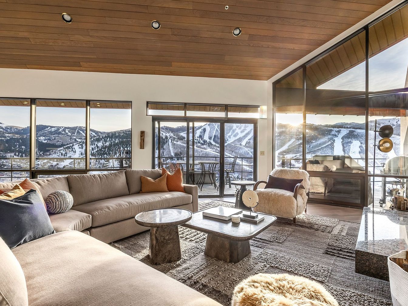This spacious living room features an inviting open layout that seamlessly blends indoor luxury with breathtaking outdoor scenery. Expansive floor-to-ceiling windows frame the stunning mountain vistas, flooding the space with natural light. The warm color palette of soft taupes and earthy tones is complemented by plush, textured furnishings, including a generously sized sectional and cozy accent chairs. A rustic coffee table, crafted from natural materials, adds character to the carefully curated decor. Family-friendly elements like a soft area rug invite relaxation, while contemporary light fixtures enhance the modern aesthetic, making this a perfect gathering space for both relaxation and entertainment.