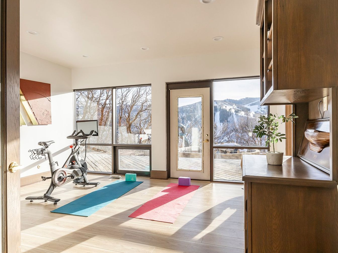 This inviting home gym features a spacious layout with large windows that flood the area with natural light, creating a bright and energizing environment for workouts. The design incorporates warm wood flooring paired with a neutral color palette, enhancing the room’s modern aesthetic. A stationary bike and yoga mats in teal and red encourage a versatile fitness routine, while the sleek, contemporary furniture complements the overall style. Architectural details, like the clean lines of the cabinetry and the smooth transition to the outdoor deck, foster an open, refreshing atmosphere, making it a perfect space for family-friendly wellness activities.