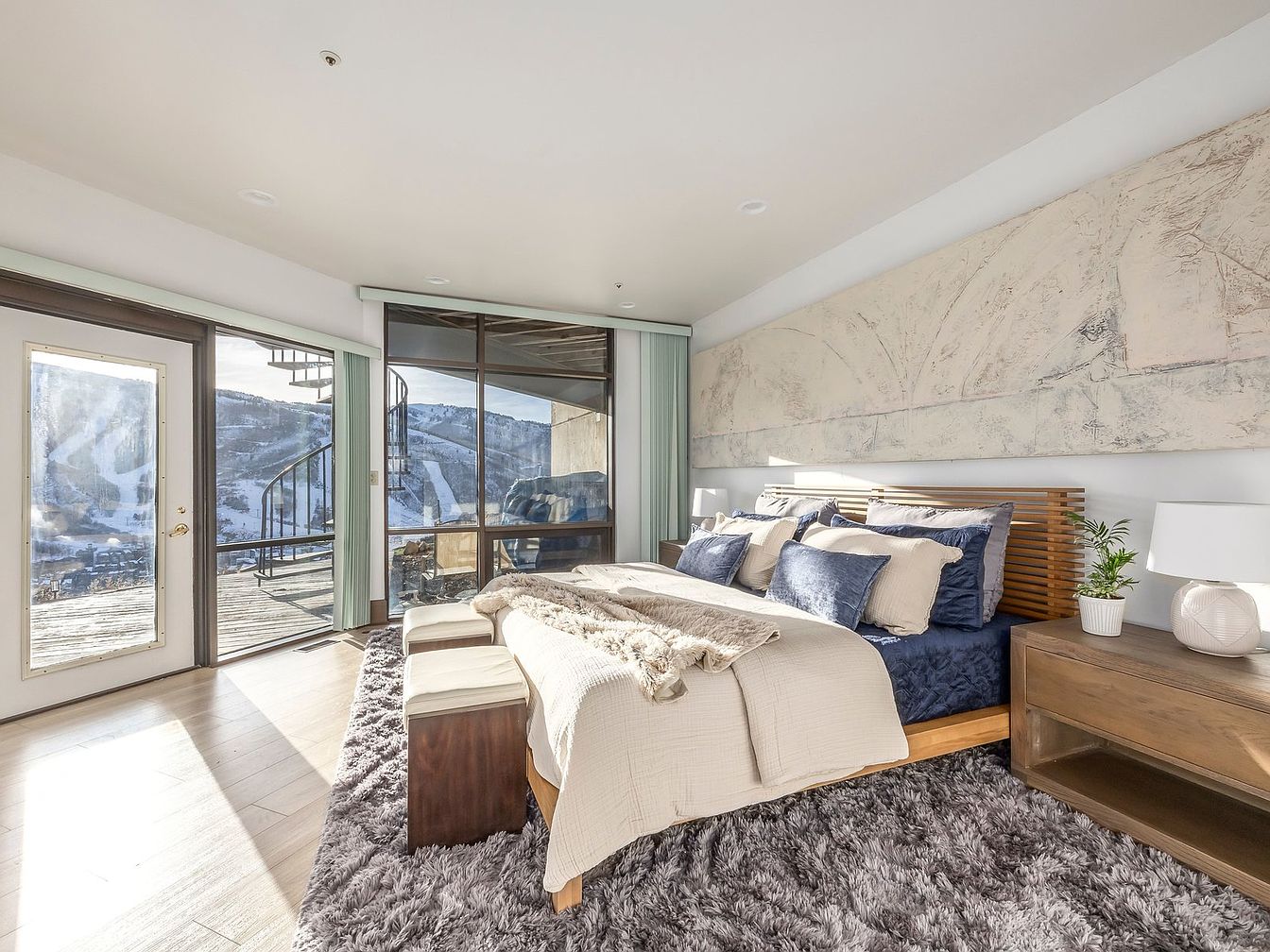 This expansive master bedroom effortlessly blends comfort and elegance. A large window allows natural light to flood the space, highlighting the stunning mountain views. The king-sized bed boasts a beautifully designed headboard with slatted wooden accents, set against a soft, artistic backdrop. Plush throw pillows in rich navy and cream invite relaxation, while a cozy beige blanket adds warmth. The plush area rug underfoot enhances the room’s inviting atmosphere. Sleek nightstands with modern lamps complement the contemporary design, and the light wood flooring ties in seamlessly with the soothing color palette, creating a serene and family-friendly sanctuary.