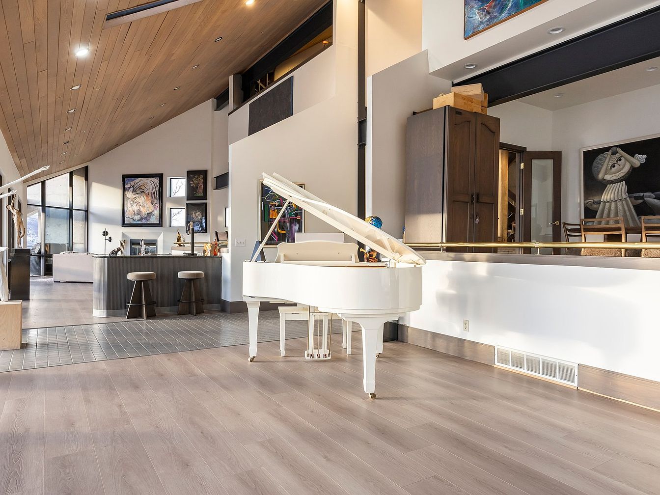 This sophisticated living room blends modern aesthetics with a welcoming ambiance. Highlighted by a stunning grand piano, the space features a soaring wooden ceiling that complements the sleek, light-toned flooring. Large windows flood the room with natural light, offering views of the outside while enhancing the airy feel. The neutral color palette, accented by vibrant artwork, creates a harmonious balance between comfort and elegance. Contemporary furniture, including stylish bar stools at a chic kitchen island, invites family gatherings. Thoughtful architectural details, like the open layout, enhance connectivity between spaces, making it ideal for both relaxation and entertainment.