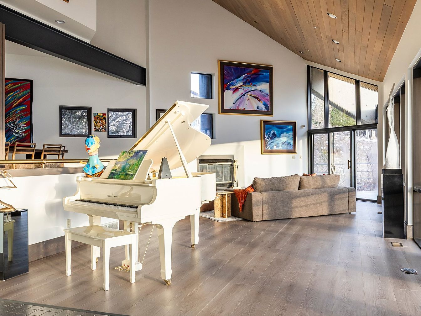 This spacious living room showcases a blend of modern and artistic design, featuring a striking grand piano as the centerpiece. The soaring ceilings, adorned with warm wooden beams, create an inviting atmosphere. Large windows flood the area with natural light, highlighting vibrant artworks that add both color and personality to the space. A comfortable gray sofa invites relaxation, complemented by a cozy throw for warmth. The open layout promotes family interaction, with a dining area visible in the background. The neutral color palette is enhanced by splashes of color from art pieces, creating a harmonious balance between elegance and comfort.