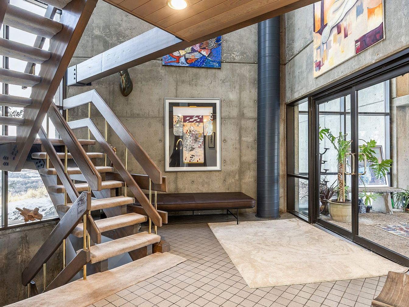 This striking entryway combines modern design with natural elements, featuring a unique blend of concrete walls and wooden accents. The open expanse allows natural light to illuminate the space, highlighting the artistic wall hangings that bring color and personality. The angled staircase, with its wooden treads and sleek metal railing, creates an inviting focal point, while a dark bench offers a practical seating option. Large windows invite the outdoors in, framing lush greenery that enhances the welcoming atmosphere. The soft, neutral color palette, punctuated by artistic splashes of brightness, provides a cozy and sophisticated entry to the home.
