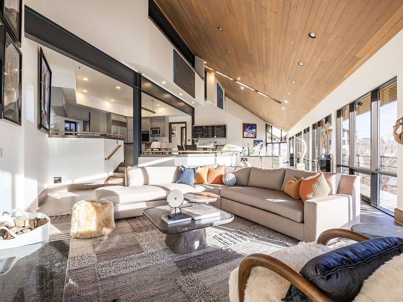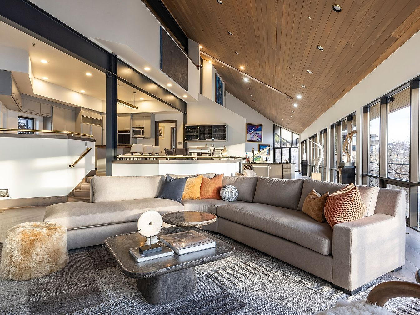 This expansive living room features a striking open-concept design with a high, vaulted wooden ceiling, creating an airy atmosphere. A cozy sectional sofa adorned with vibrant pillows invites relaxation, while a textured area rug adds warmth beneath. The sleek coffee table contrasts beautifully with the plush furnishings, enhancing the contemporary aesthetic. Large windows flood the space with natural light, promoting a seamless connection with the outdoors. The adjacent kitchen, visible through a stylish railing, offers sleek cabinetry and modern appliances, perfect for family gatherings. Artistic accents and thoughtful decor elevate the overall inviting ambiance, making it a perfect family-friendly haven.