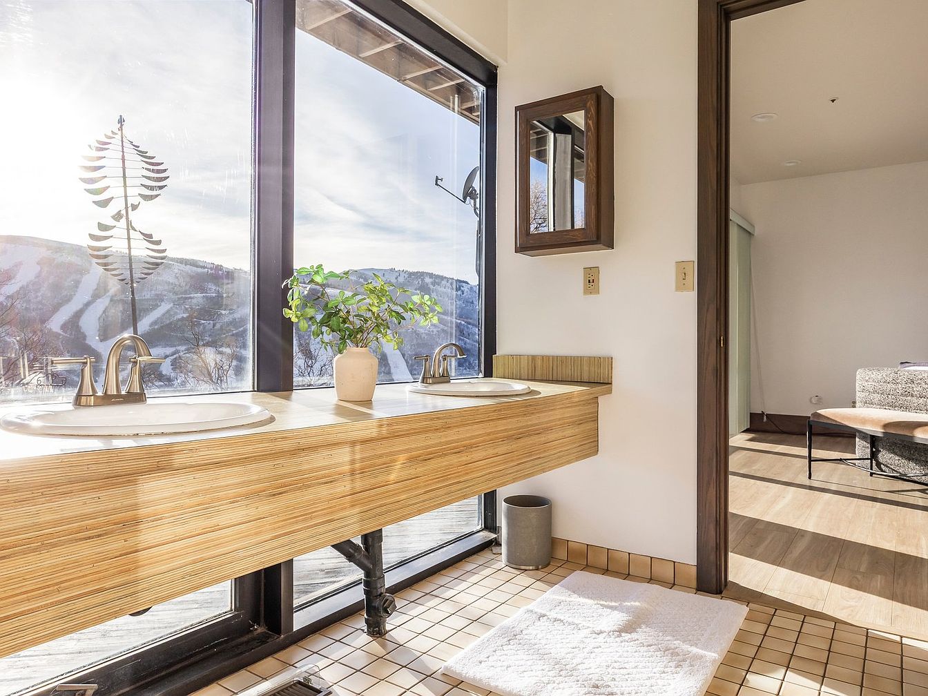 This modern bathroom features a streamlined design, combining natural materials with expansive views. A sleek wooden floating vanity hosts dual sinks, enhancing functionality while keeping the space open and airy. Large floor-to-ceiling windows invite natural light, offering breathtaking mountain scenery, perfect for an invigorating start to the day. The neutral color palette, accented with warm wood tones and soft textiles, creates a soothing atmosphere. Family-friendly elements include easy-to-clean surfaces and a spacious layout. Minimalist decor combined with practical fixtures ensures both elegance and comfort, making it an inviting sanctuary within the home.