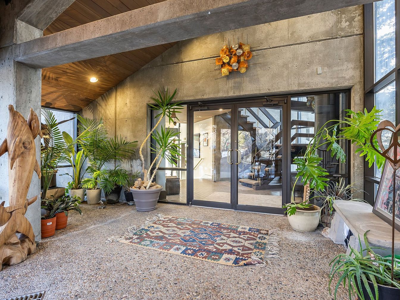 This stunning entrance foyer combines modern aesthetics with natural elements, featuring a striking blend of polished concrete walls and warm wooden beams overhead. Lush greenery from various indoor plants adorns the space, creating a lively atmosphere. The high ceilings enhance the sense of openness, complemented by large glass doors that invite in natural light. A beautifully patterned area rug adds a touch of color and texture, providing comfort underfoot. The handcrafted wooden sculpture serves as a unique focal point, reflecting an artisan touch. This welcoming space sets a perfect tone for family gatherings and interactions.