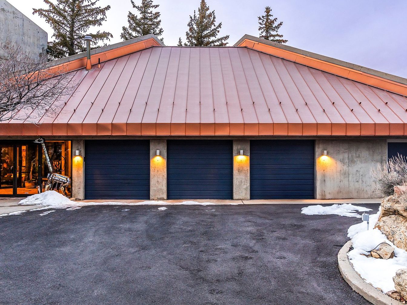 This contemporary garage showcases a stunning blend of architectural elements, featuring a striking copper roof that adds warmth and character. The dark blue garage doors lend a sophisticated contrast against the smooth, textured concrete walls. Complementing the design are stylish outdoor sconces, which illuminate the entrance, enhancing its welcoming ambiance. The sloped roofline not only provides visual interest but also assists in snow drainage, reflecting a thoughtful approach to functionality. Lush greenery and smooth asphalt create a harmonious balance, making this space not only attractive but also family-friendly, ideal for a modern lifestyle.