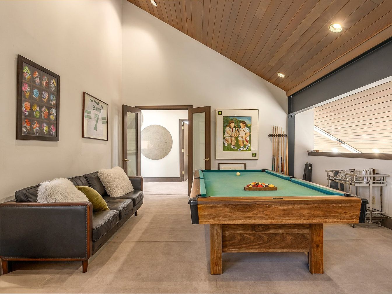 The game room features a sleek pool table at its center, inviting hours of family fun. Elegant dark wood beams frame the high, slanted ceiling, enhancing the room’s spaciousness. A plush black sofa adorned with fluffy white cushions offers a cozy seating area for relaxation. Artworks on the walls, including sports memorabilia and vibrant prints, contribute a playful touch, making the space lively and engaging. The neutral color palette, accented by warm tones, creates an inviting atmosphere. A small bar cart nearby suggests a space perfect for entertaining friends and family during game nights.