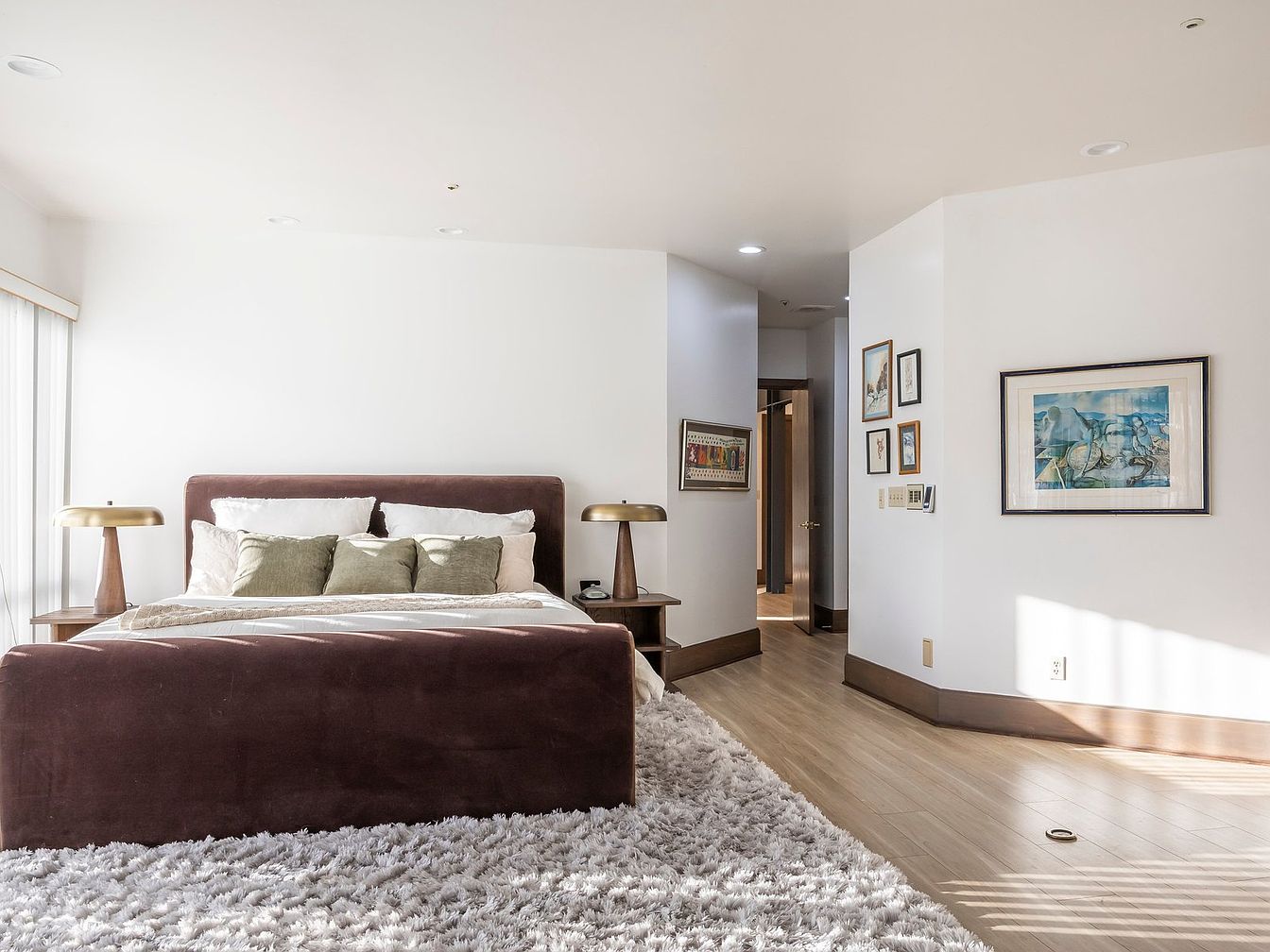 This master bedroom offers a serene escape with its spacious layout and contemporary design. The plush, dark upholstered bed, adorned with soft pillows in muted tones, promises comfort. Warm wooden accents showcase both nightstands and trim, enhancing the cozy vibe. A large, fluffy area rug invites relaxation while the expansive windows bathe the room in natural light, emphasizing the clean white walls. Artistic wall hangings bring personality, complementing the simple yet elegant color scheme. The thoughtful arrangement and modern light fixtures create an inviting atmosphere, perfect for unwinding after a long day. A welcoming sanctuary for restful nights.