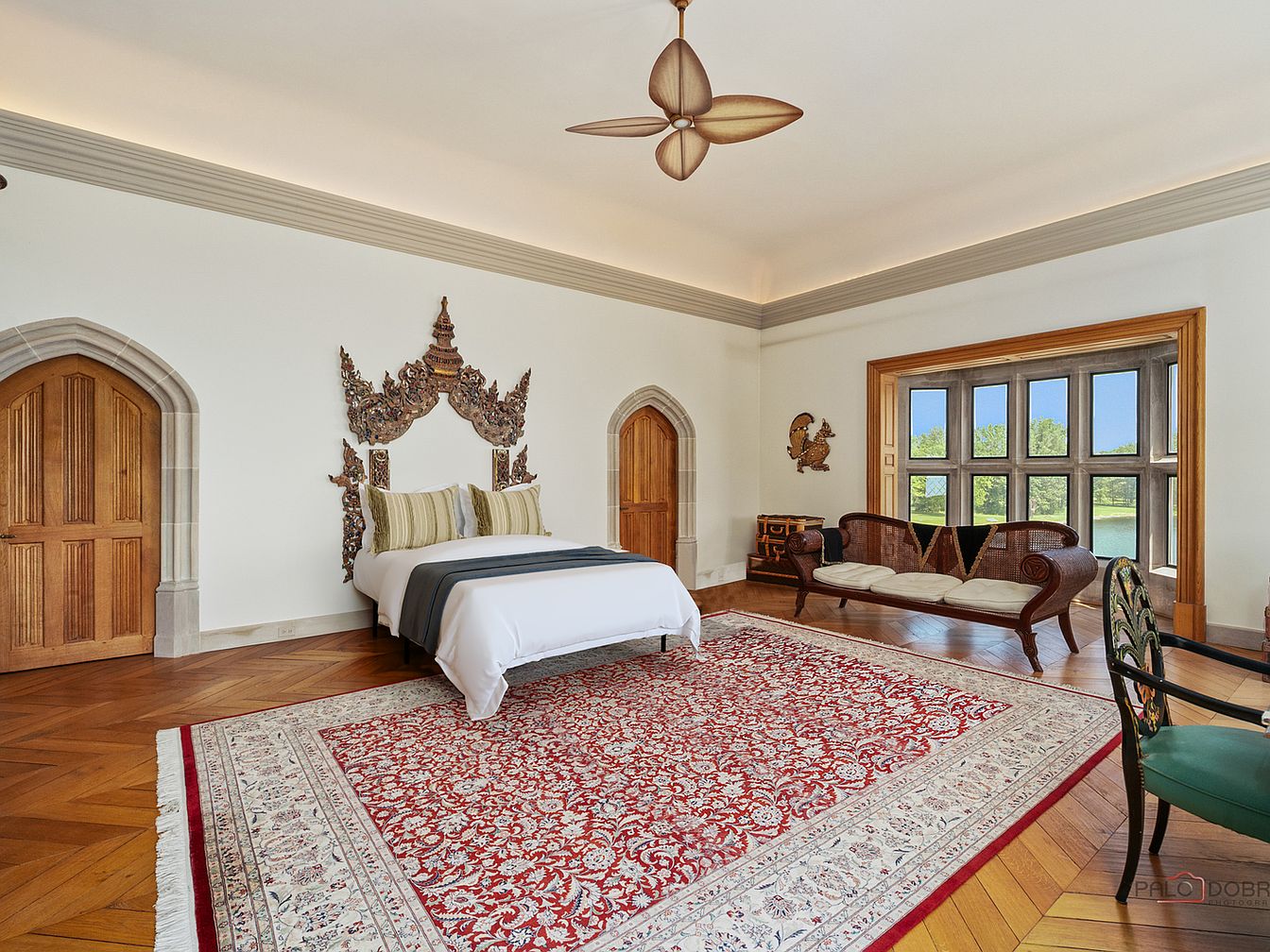 This elegant master bedroom features a spacious layout with warm hardwood floors laid in a classic chevron pattern, complemented by a large Persian-style area rug adding warmth and intricate detail. A grand carved wooden headboard serves as a regal centerpiece for the bed, flanked by arched wooden doors with stone accents that offer architectural character. Generous windows framed in wood usher in natural light, creating a bright family-friendly atmosphere. A traditional settee and stylish accent chair comfortably accommodate relaxation and conversation, while subtle decorative touches and neutral wall tones harmonize the blend of classic and global-inspired design elements.
